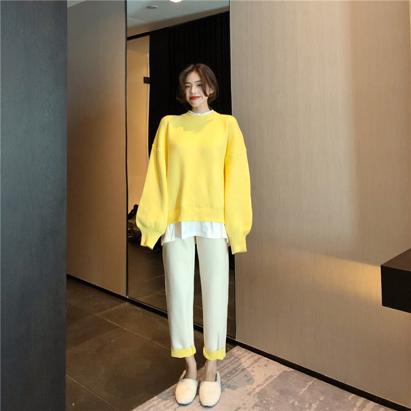 燈籠袖假兩件拼接毛衣女秋冬2018新款潮+撞色復合寬松蘿卜褲套裝