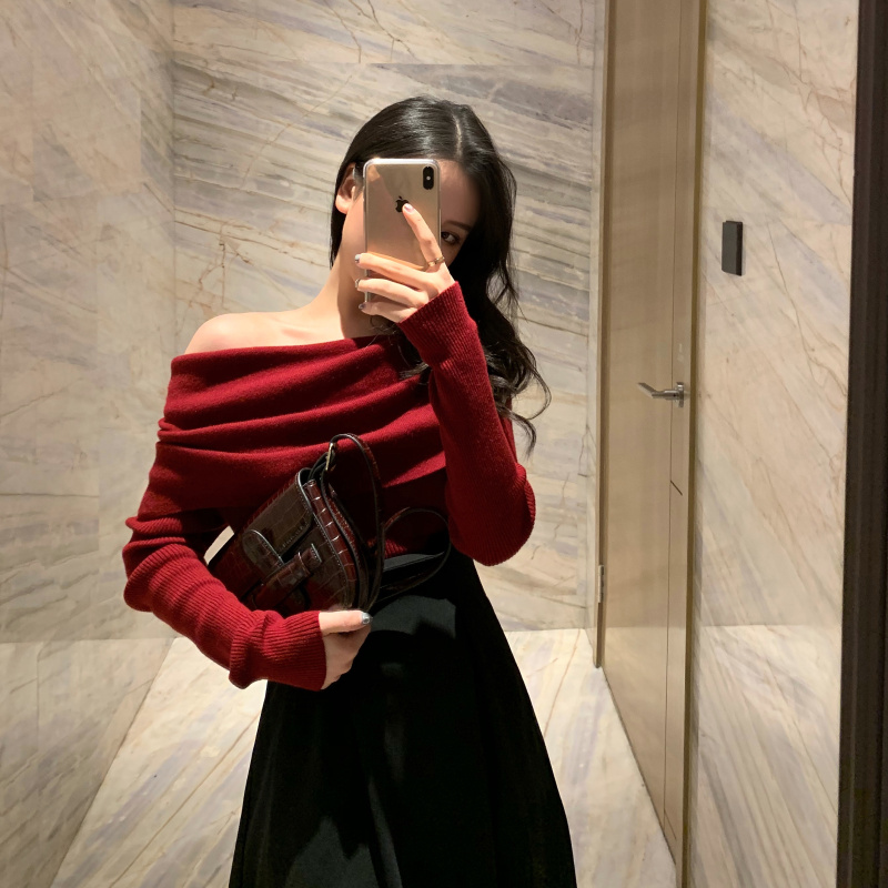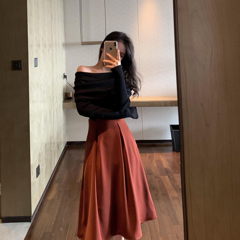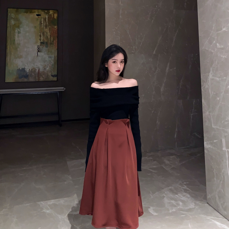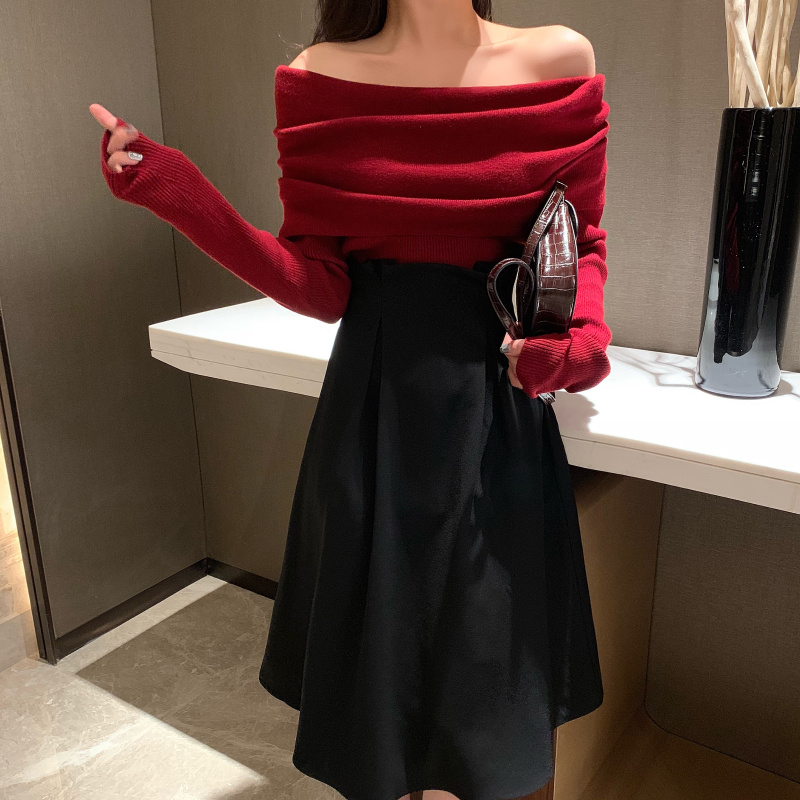 慵懶風短款顯瘦套頭一字肩毛衣綁帶中長款顯瘦高腰半身裙時尚套裝