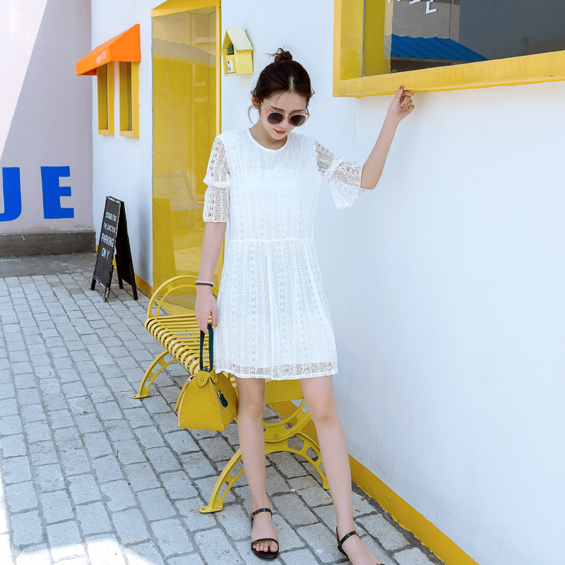 夏裝新款韓版女裝小清新喇叭短袖連衣裙蕾絲寬松中長款裙子潮