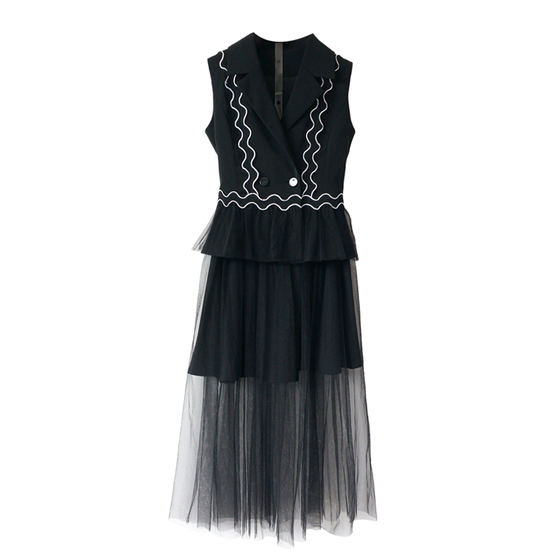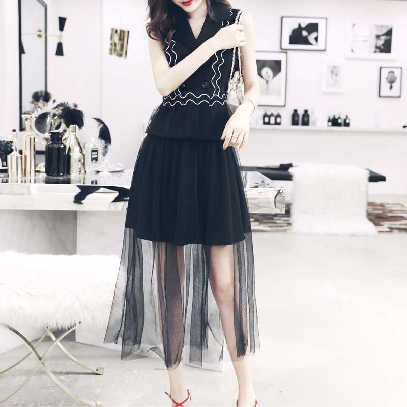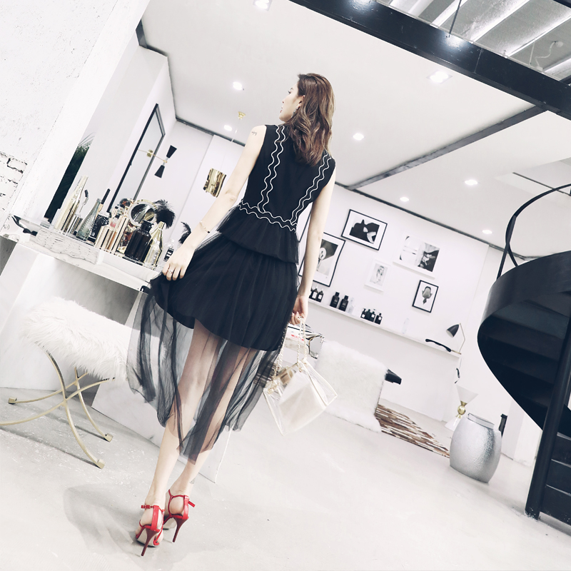 / S秀時尚氣質顯瘦兩件套女裝2018夏季新款拼色上衣網紗半身裙套裝