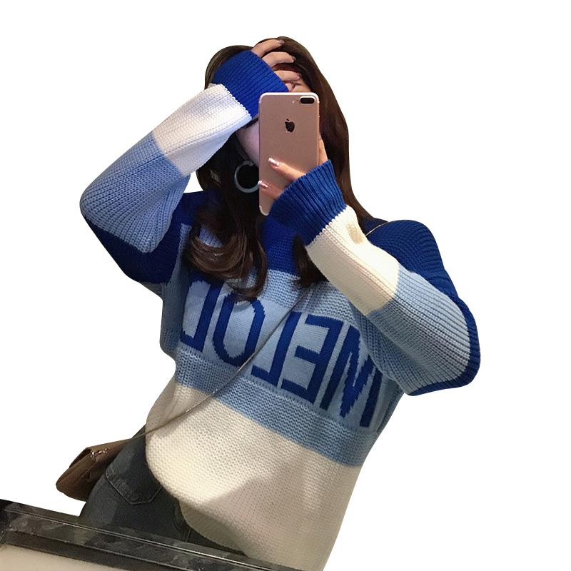 2018韓版時尚新款早秋針織衫女長袖寬松漸變色字母圓領打底毛衣潮