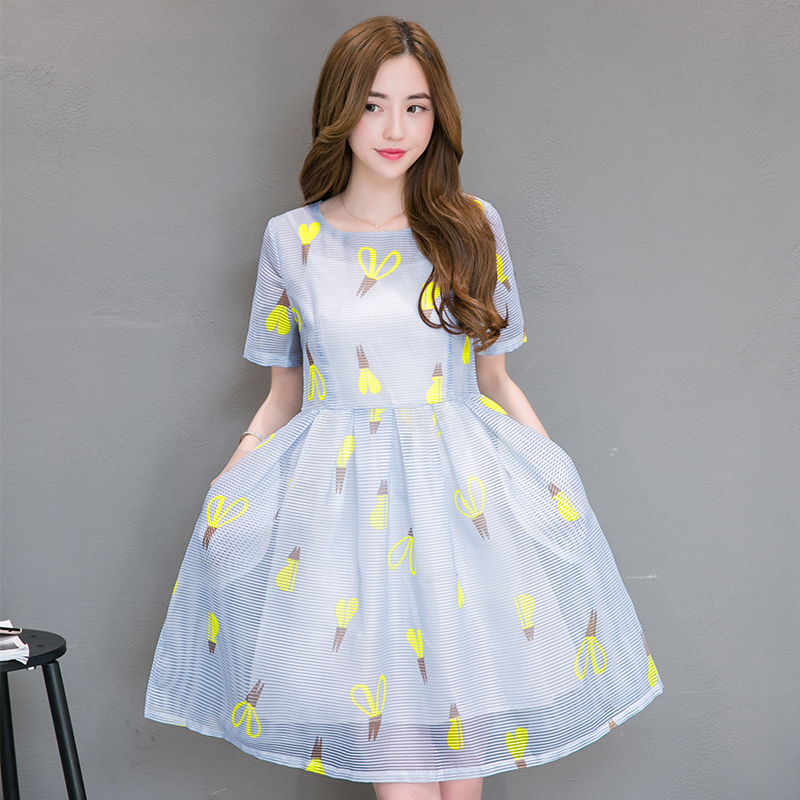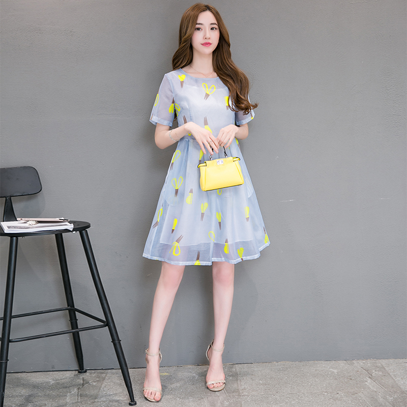 / 夏新款女裝修身甜美淑女中長款印花雪紡歐根紗短袖連衣裙女潮