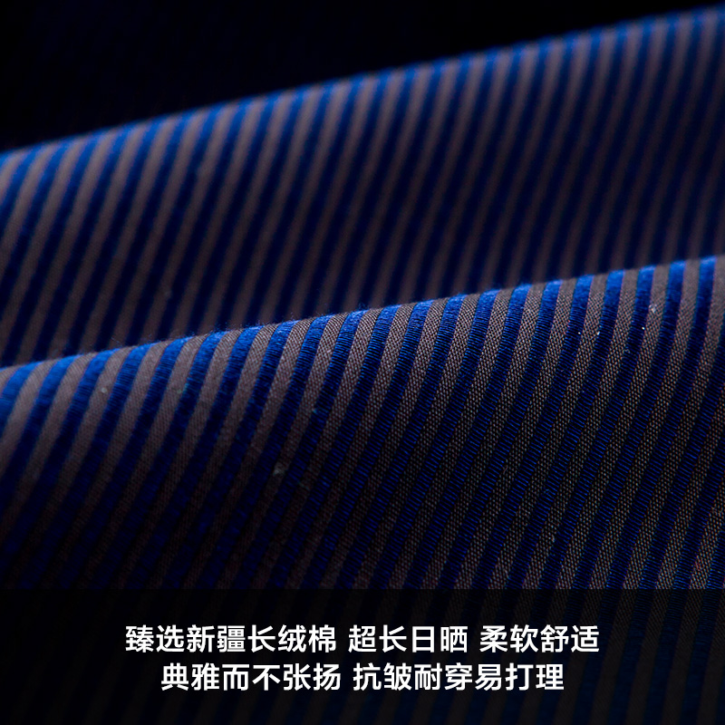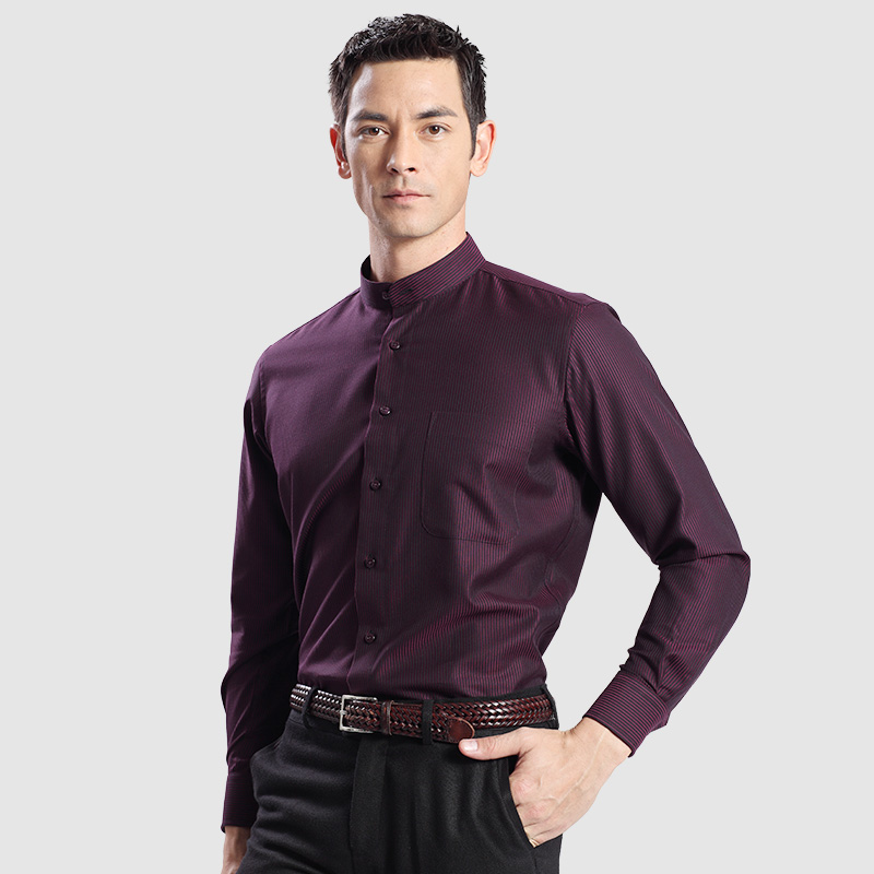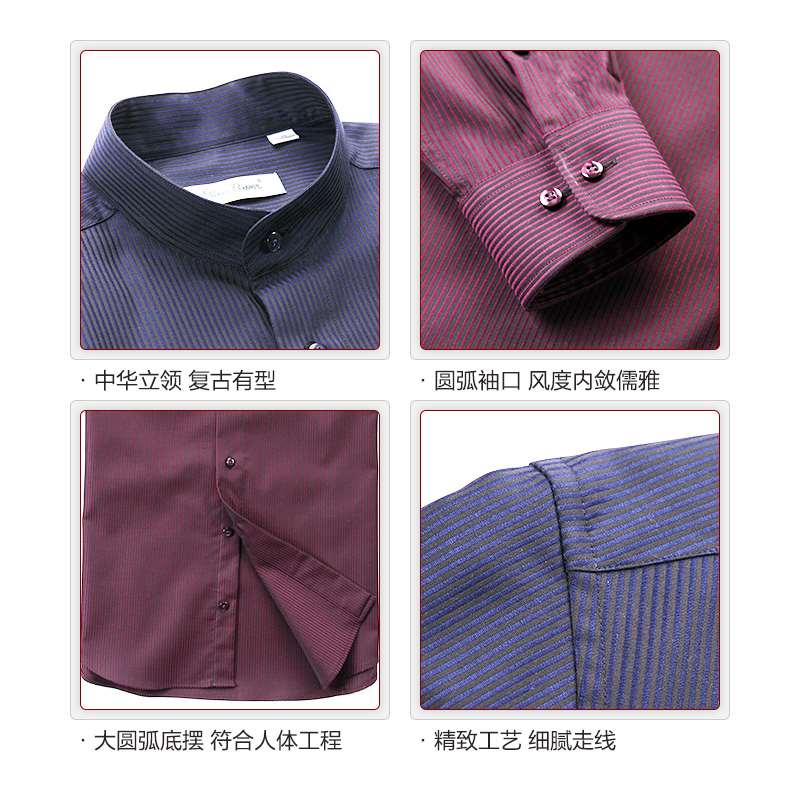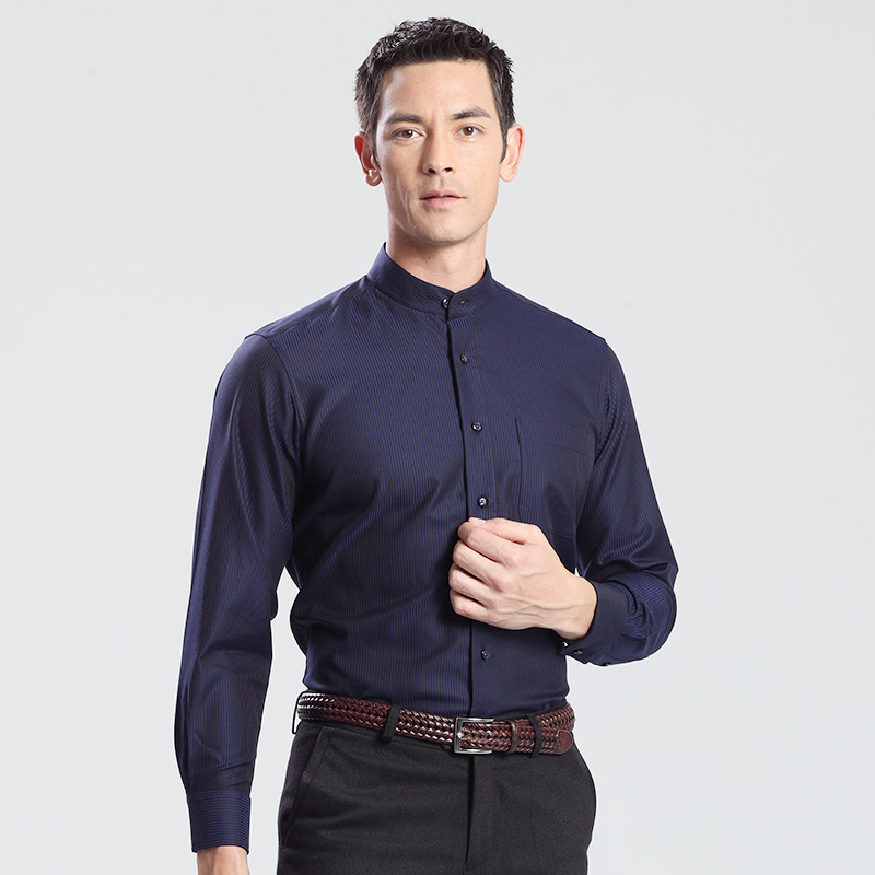 寶藍色中山裝立領襯衫男長袖暗紅色條紋中式男裝圓領藍河男士襯衣