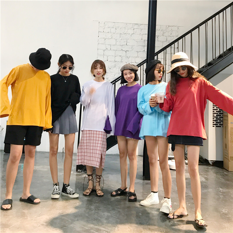 / 秋裝女裝韓版純色寬松百搭糖果色T恤學生中長款長袖體恤顯瘦上衣