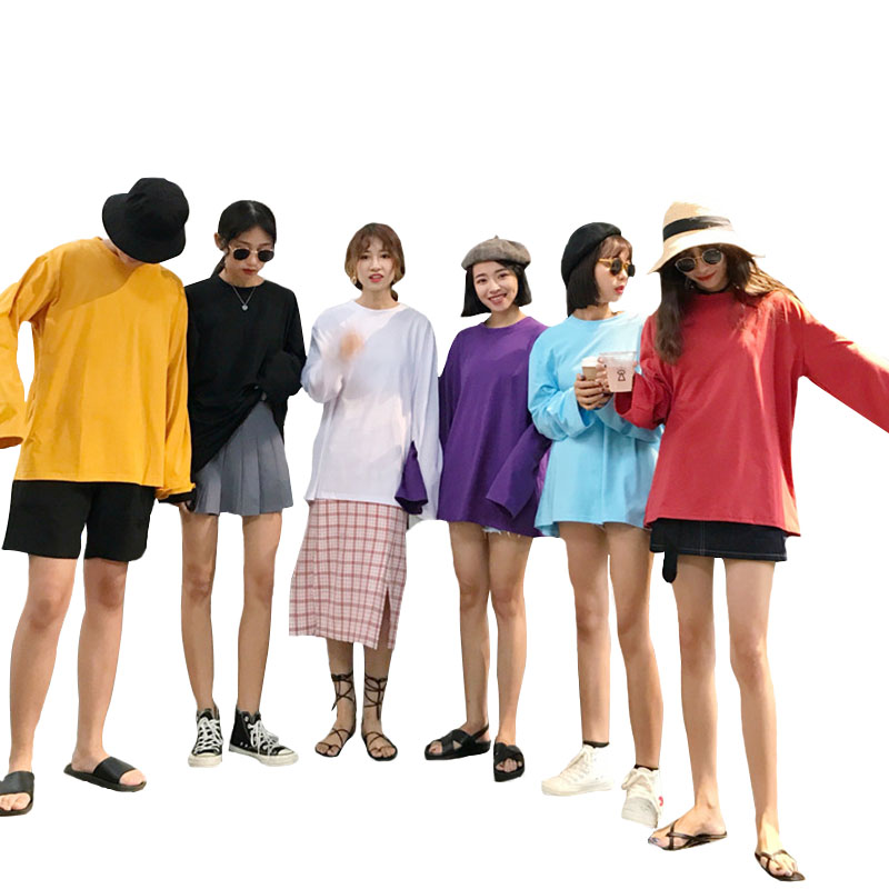 秋裝女裝韓版純色寬松百搭糖果色T恤學生中長款長袖體恤顯瘦上衣