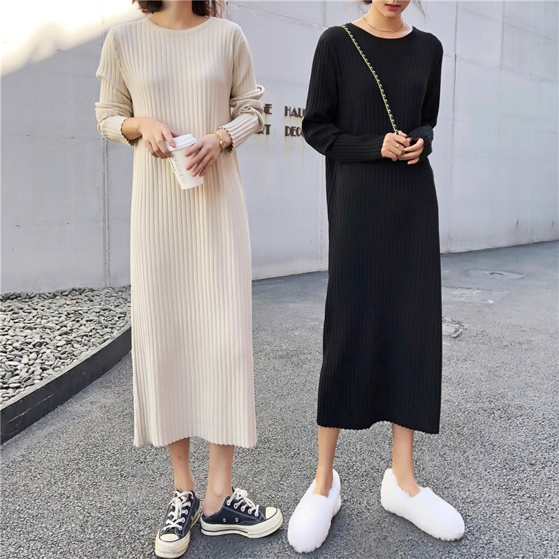 韓版慵懶風新款秋冬連衣裙百搭chic圓領坑條長袖打底裙過膝裙女潮