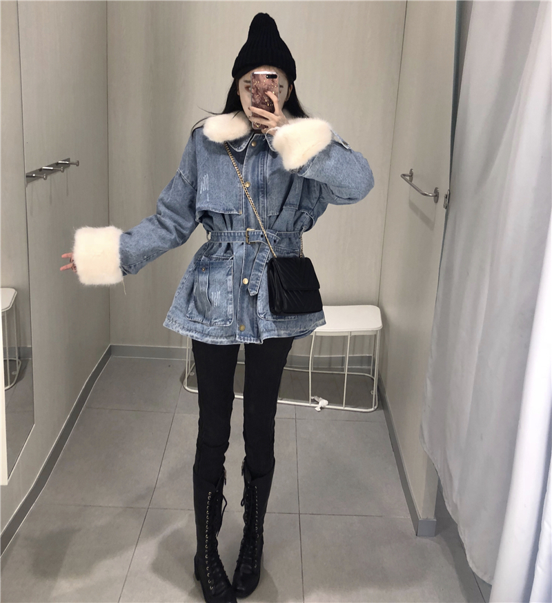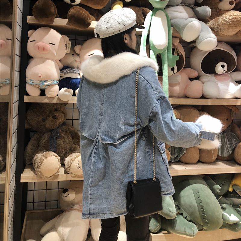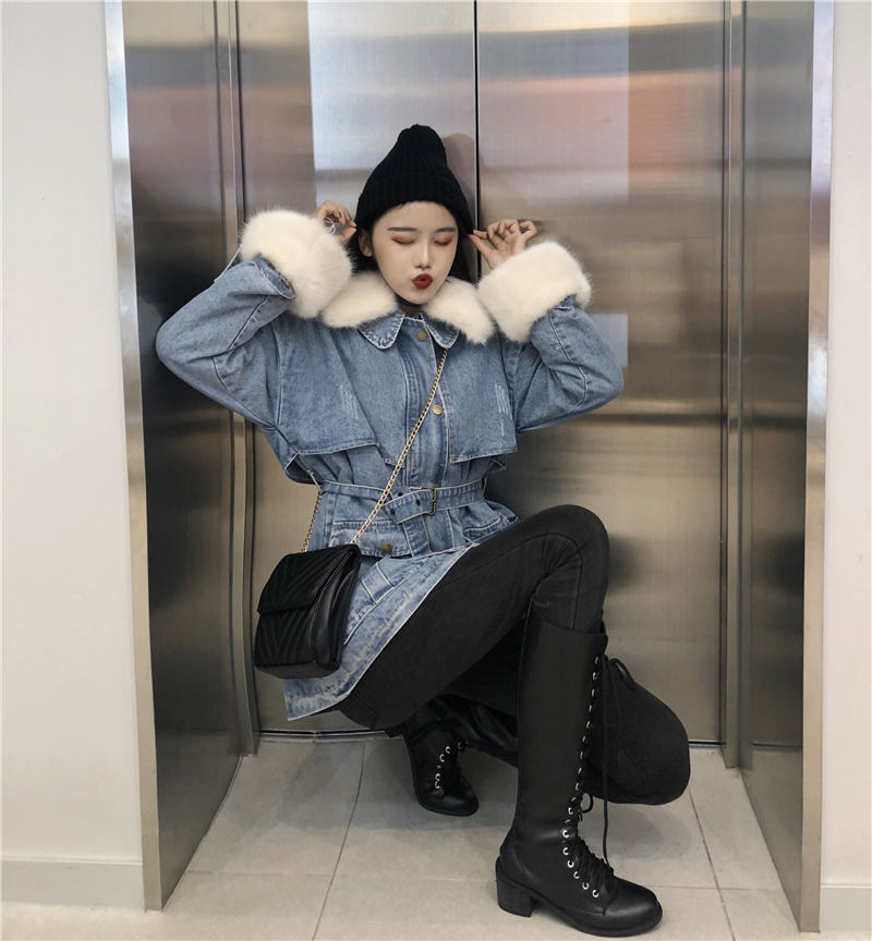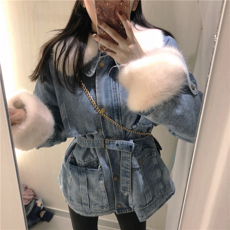 / 港味牛仔大衣新款時尚氣質冬季大毛領毛毛袖學生百搭可愛收腰外套