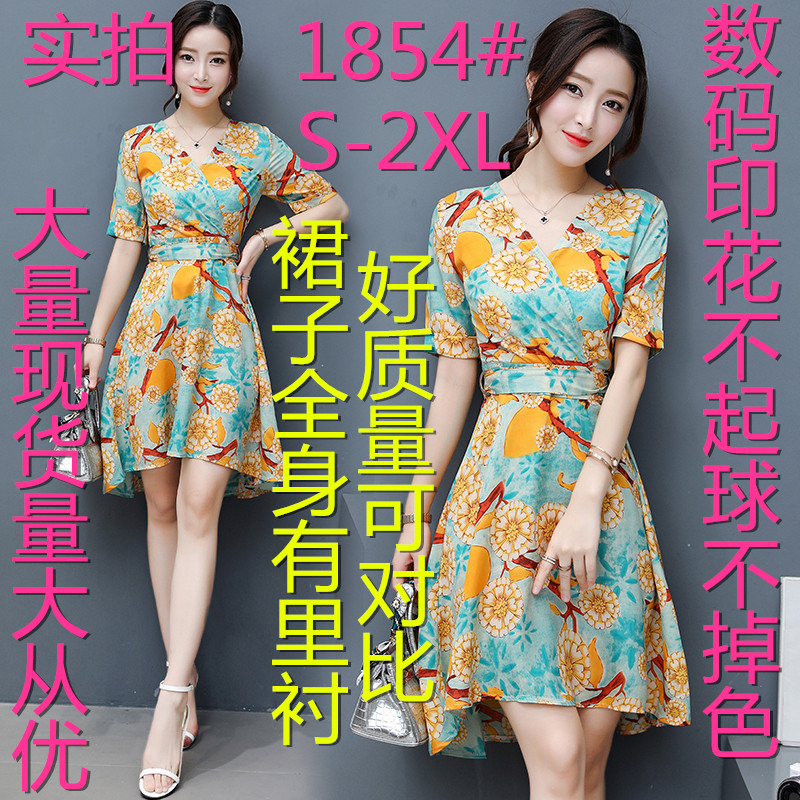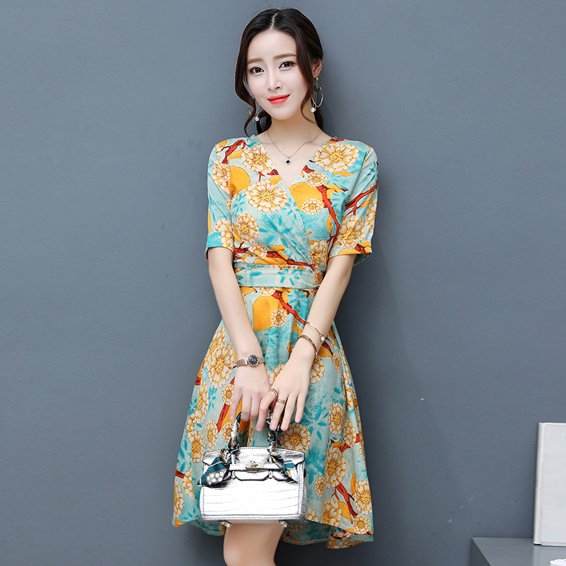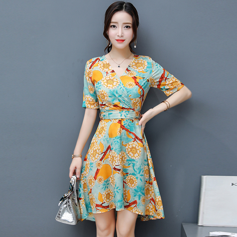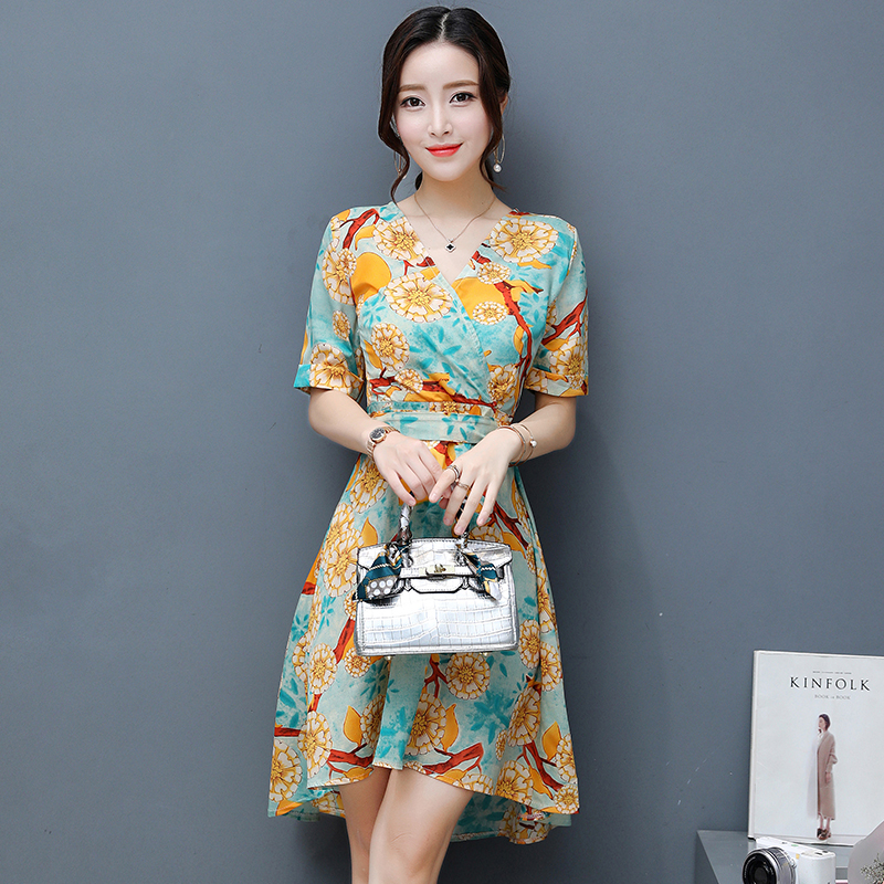 / 夏季新款女裝韓版氣質短袖修身裙子中長款印花雪紡連衣裙女潮