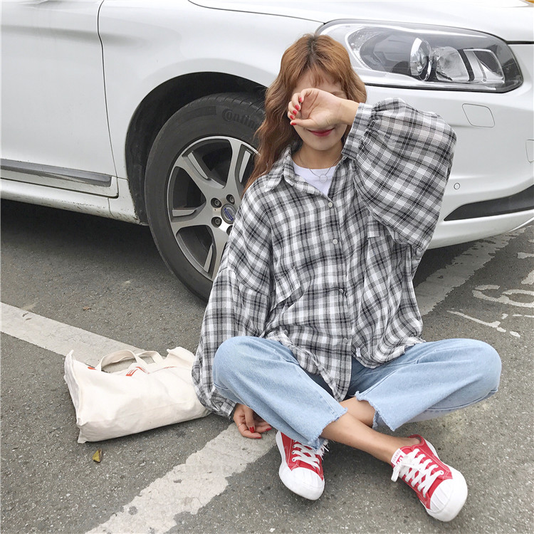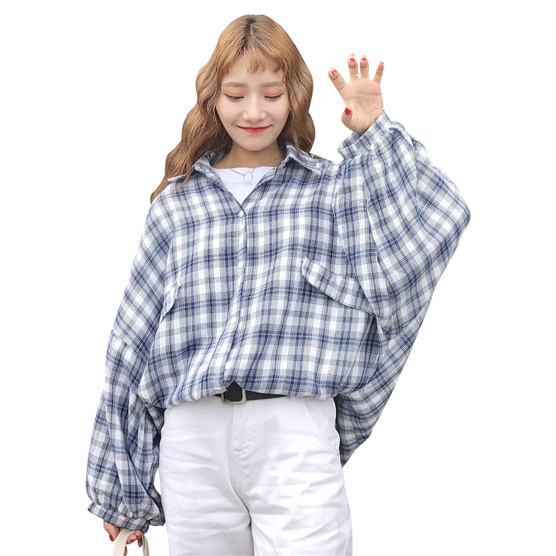 / 秋裝女裝新款韓版寬松百搭蝙蝠袖格子襯衫大袖子長袖襯衣上衣學生