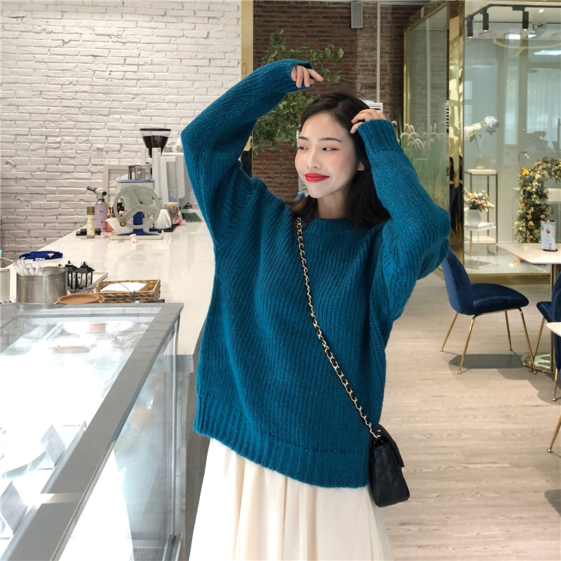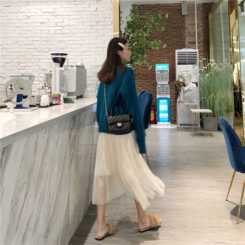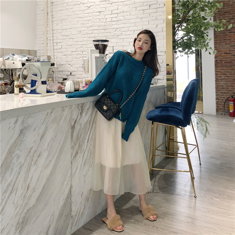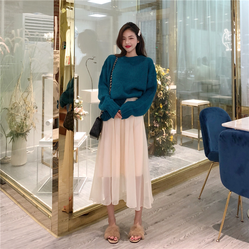 新款厚實慵懶蝙蝠袖寬松毛衣少女高腰百搭半身紗裙時尚套裝兩件套