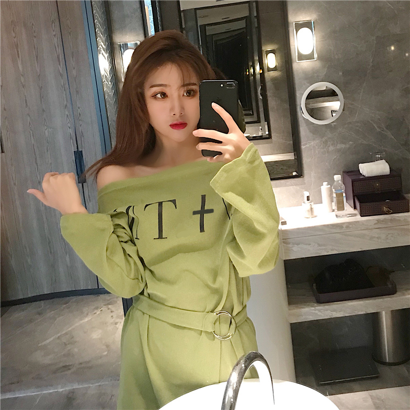 港味chic2018新款韓版一字露肩晚晚風百搭高腰綁帶寬松顯瘦連衣裙