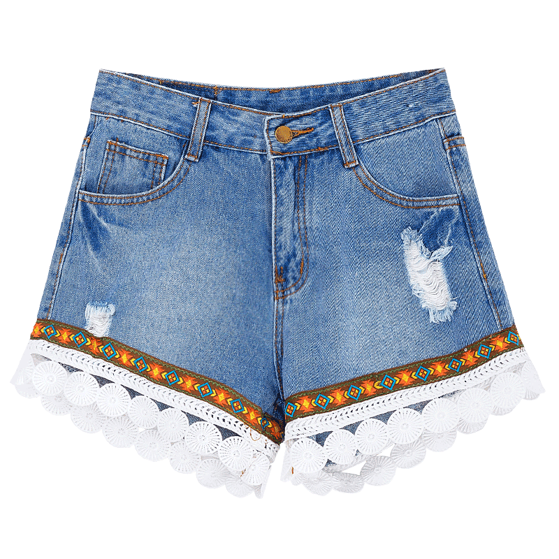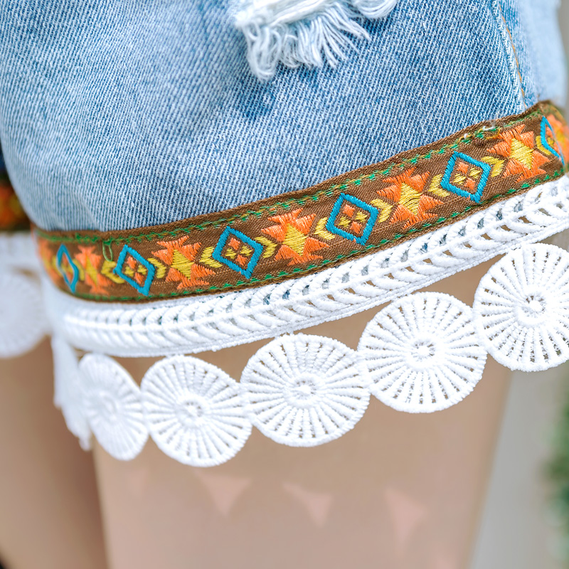 重點是在牛仔短褲的下擺處的名族風特色的蕾絲花邊的拼接