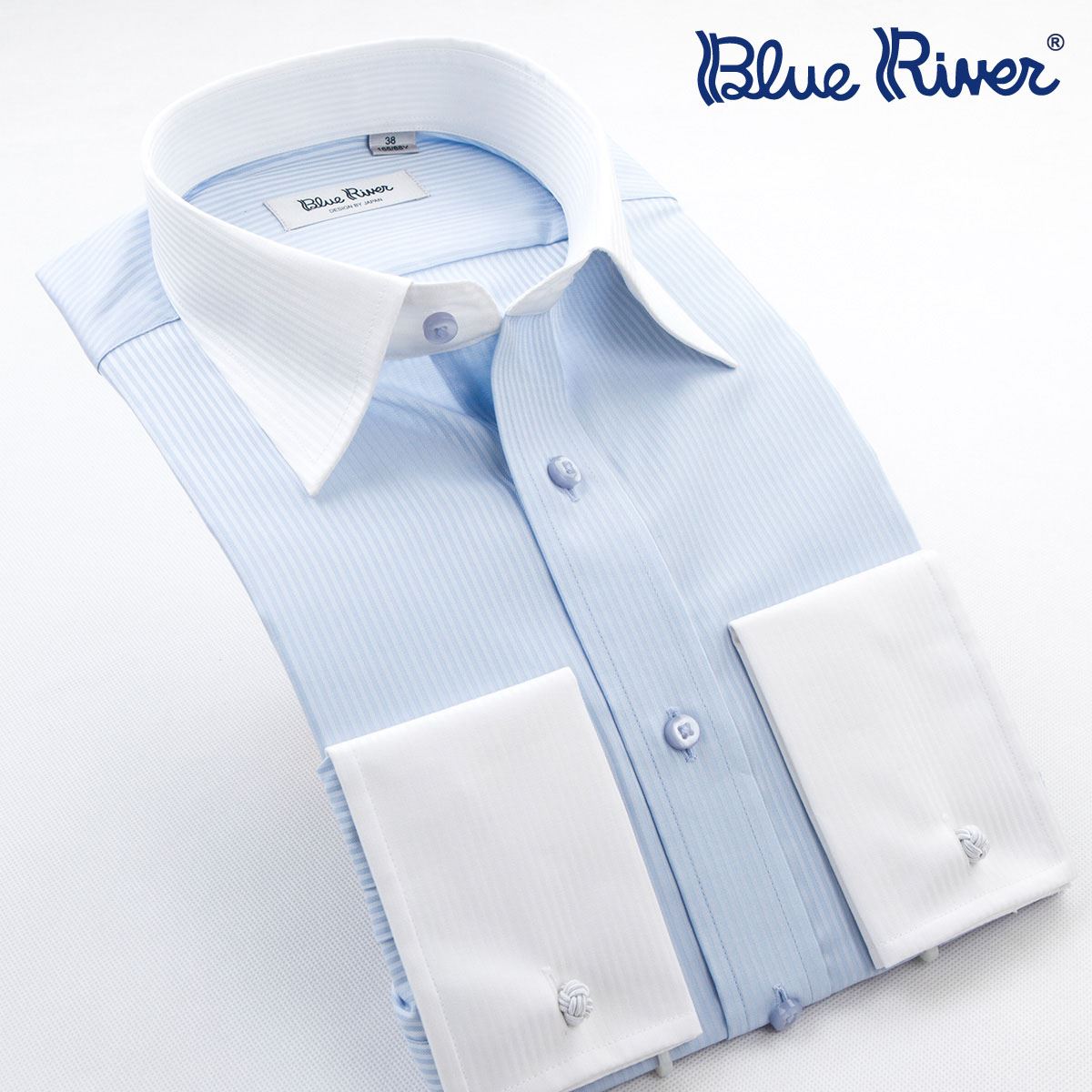 紫色法式袖扣襯衫男長袖天藍色條紋純棉免燙商務正裝襯衣秋季新品