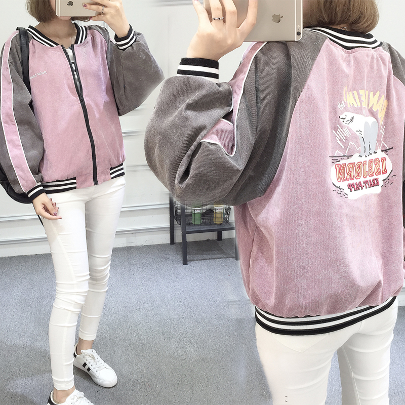 / 春裝新款韓版原宿風BF寬松學生字母拼色棒球服燈芯絨外套女夾克潮