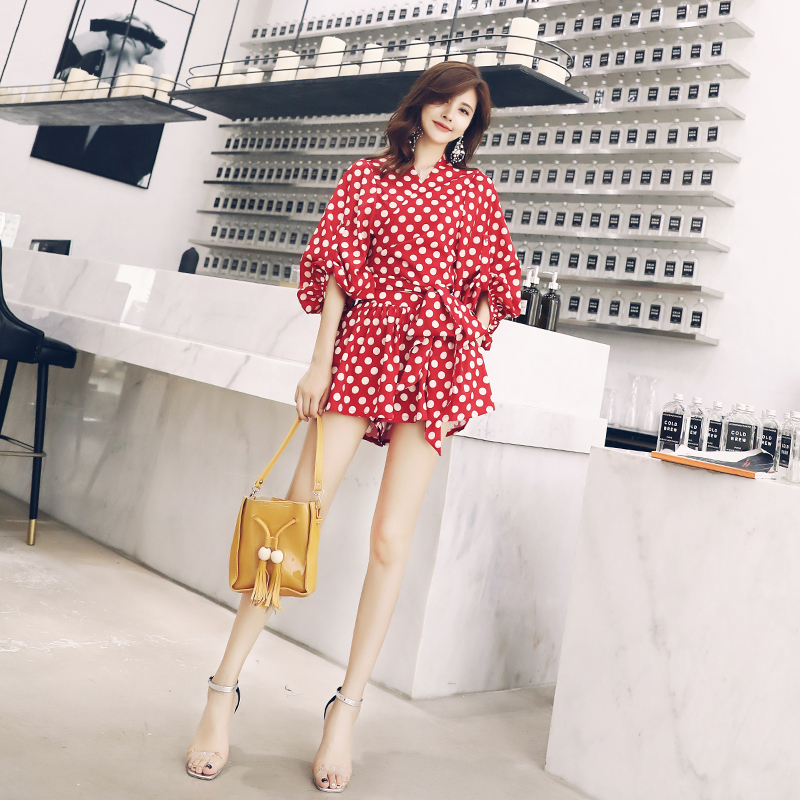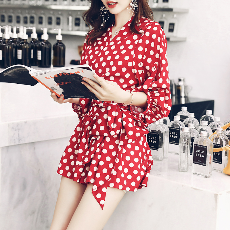 洋氣套裝2018夏裝新款圓點韓版收腰長袖上衣女時尚短褲兩件套女潮