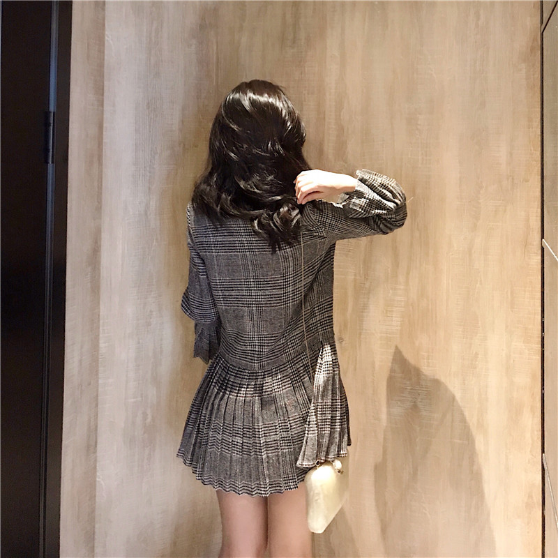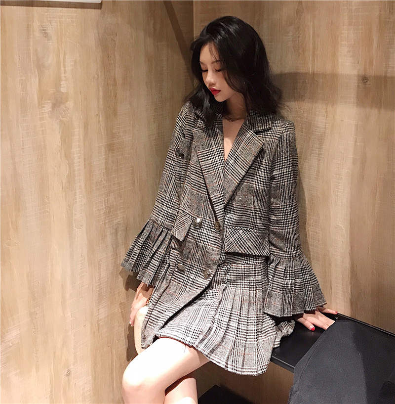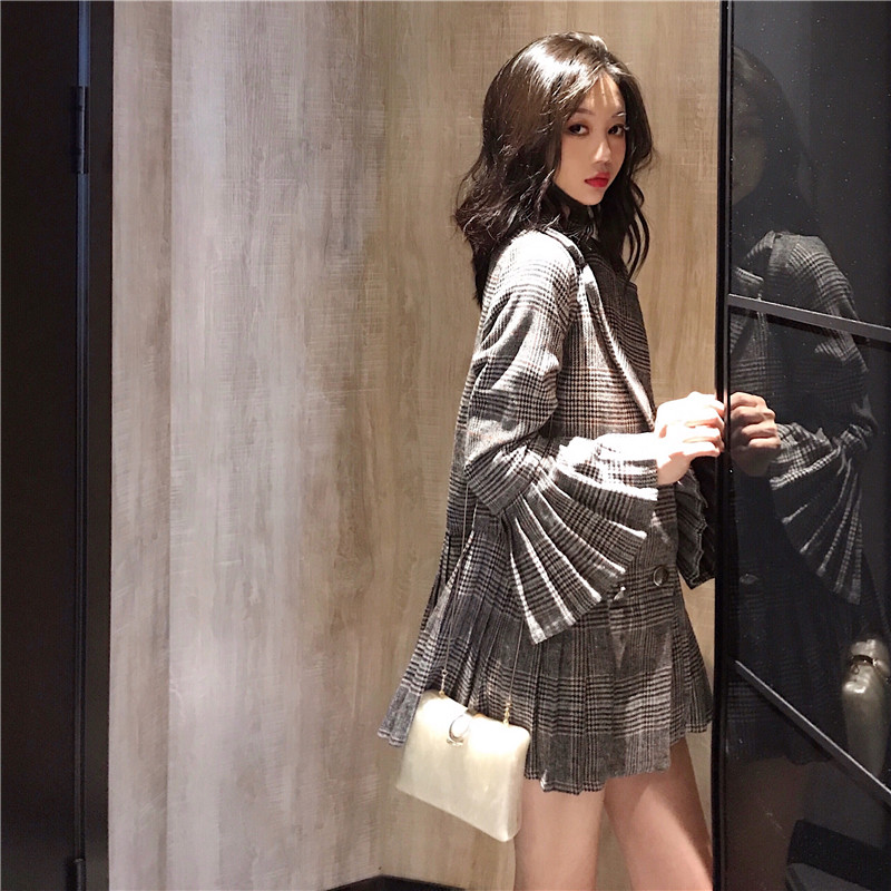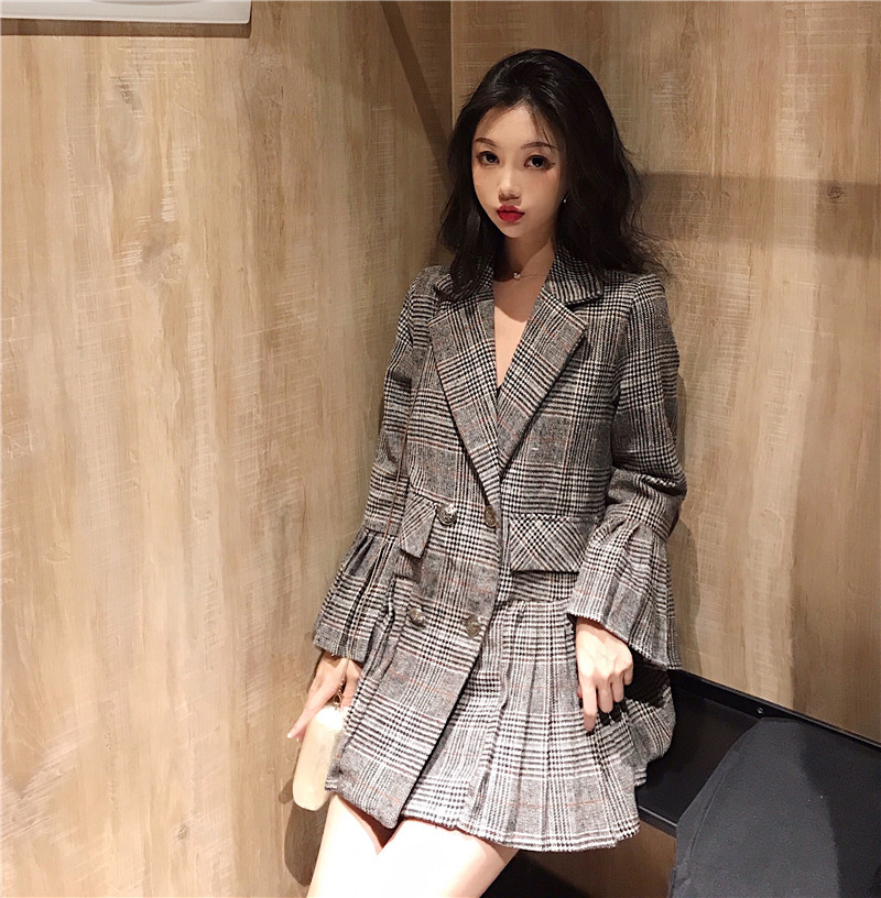 / 小香風時尚雙排扣修身格子西裝外套女秋季新款韓版百褶長袖上衣潮