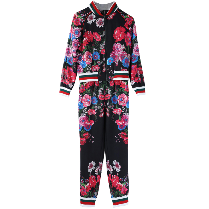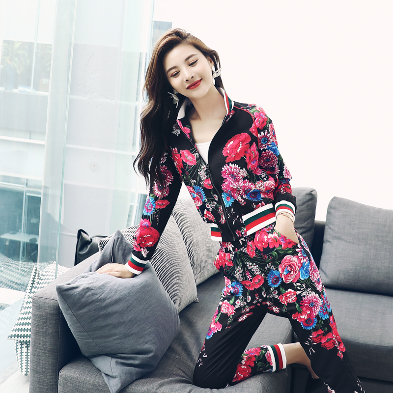 / 2018秋裝新款休閑套裝女復古時髦印花長袖夾克長褲時尚洋氣兩件套