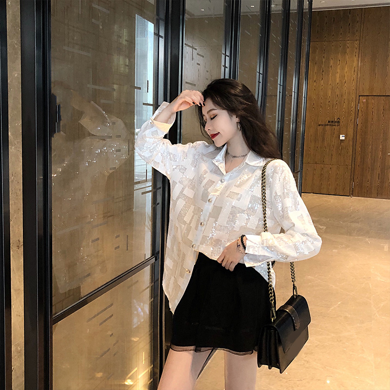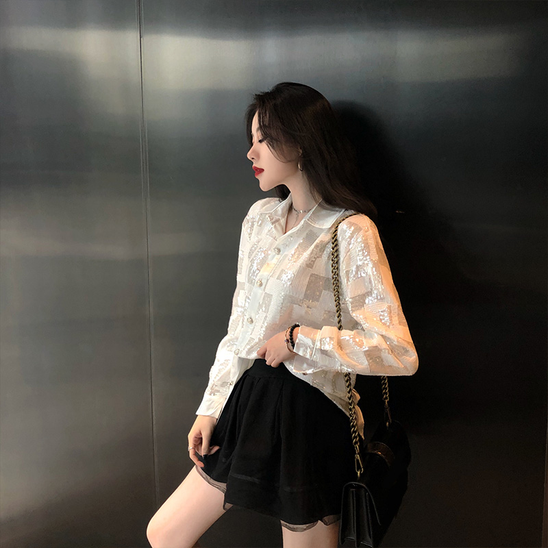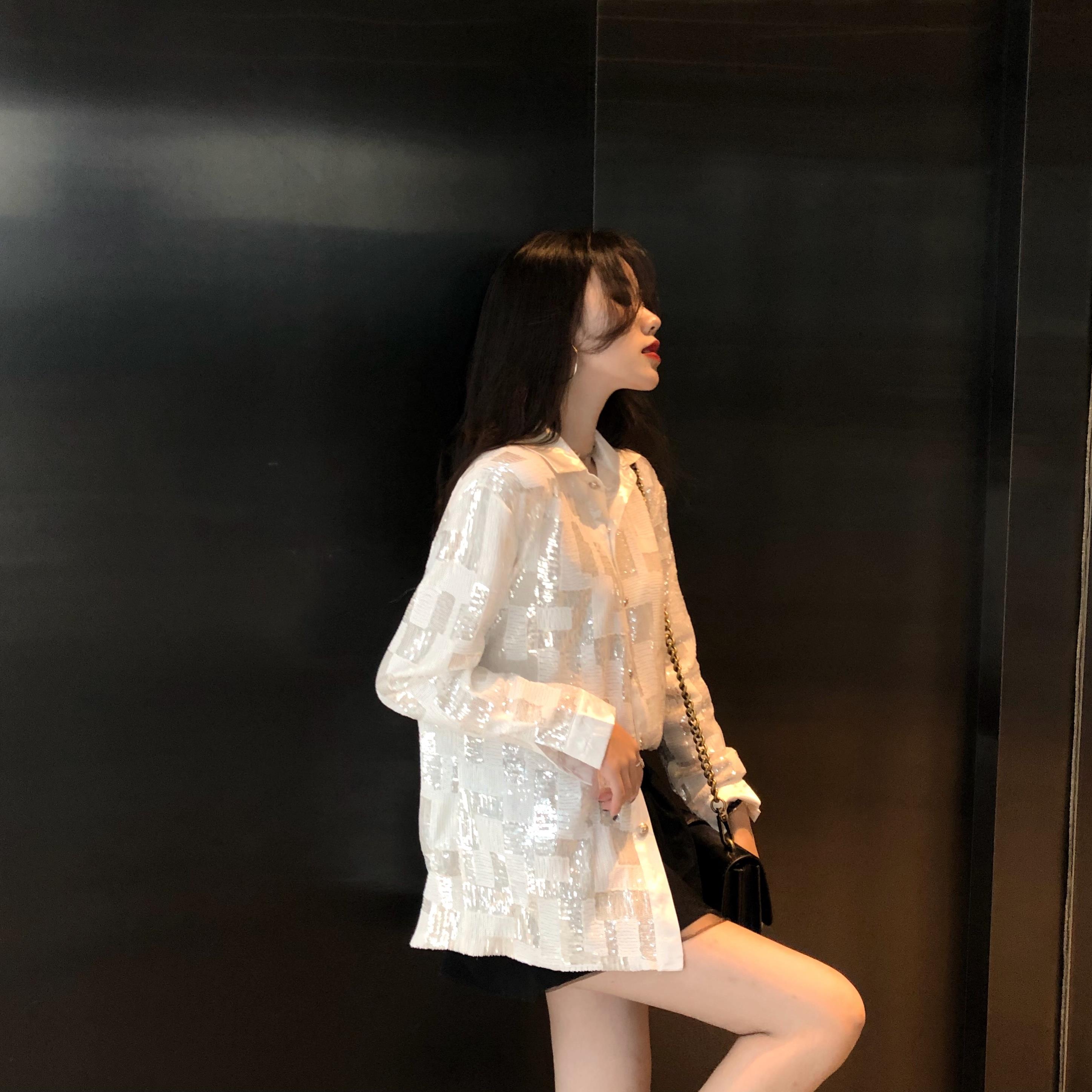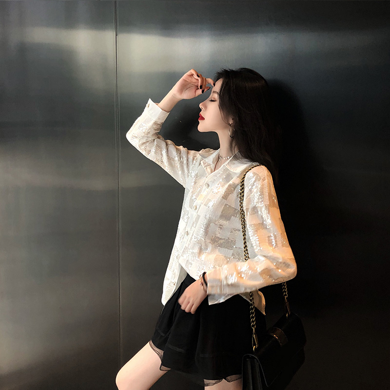 網紅同款秋季女裝新款白色亮片格子襯衫時尚百搭長袖開衫上衣潮