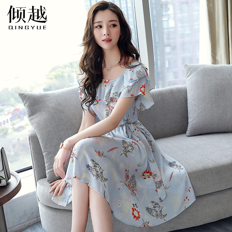 2017夏季短袖斜肩短裙中長款收腰一字領氣質連衣裙雪紡印花公主裙