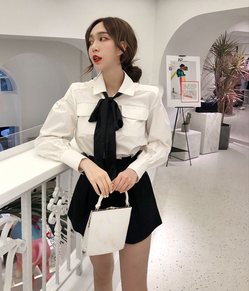 新款秋季韓版純色翻領襯衫立體剪裁闊腿高腰短褲時尚套裝女配領帶