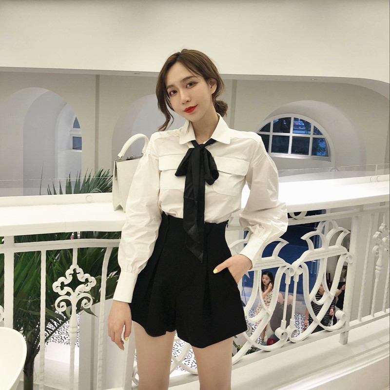 / 新款秋季韓版純色翻領襯衫立體剪裁闊腿高腰短褲時尚套裝女配領帶