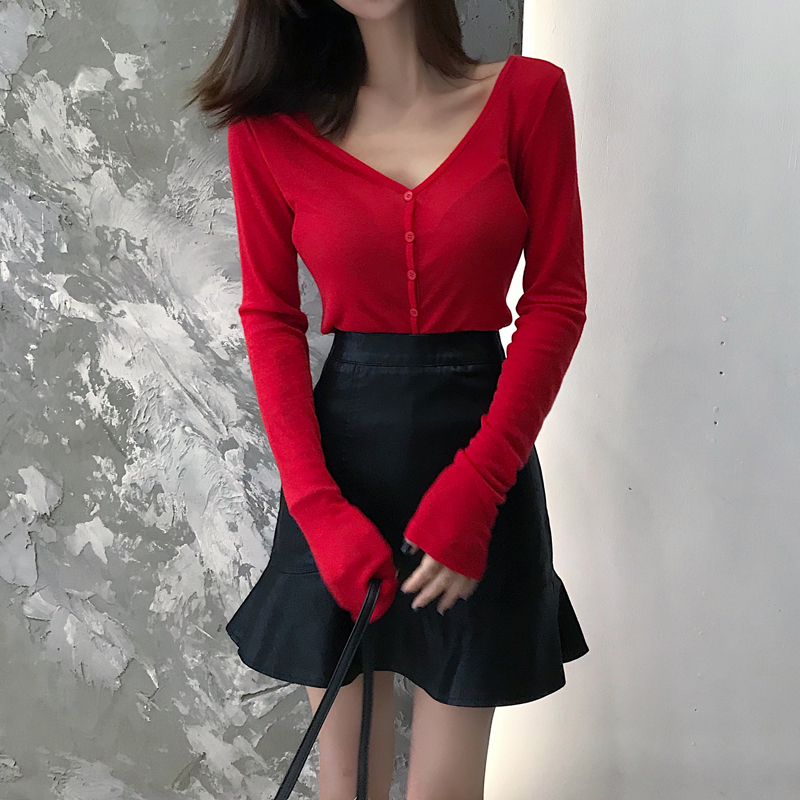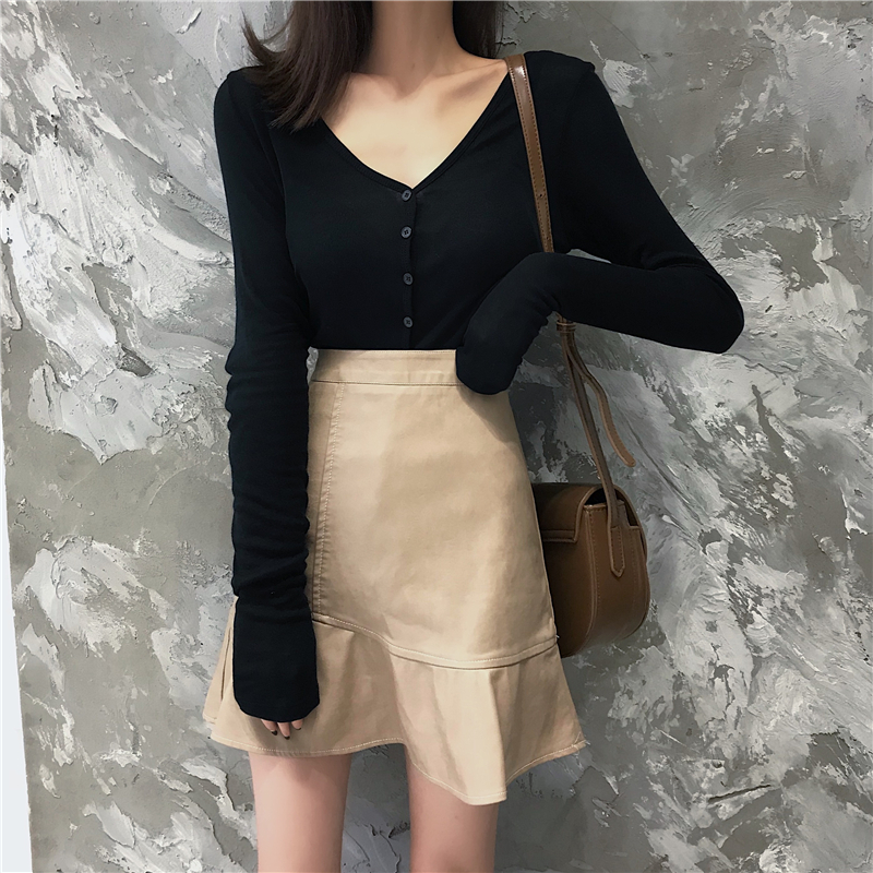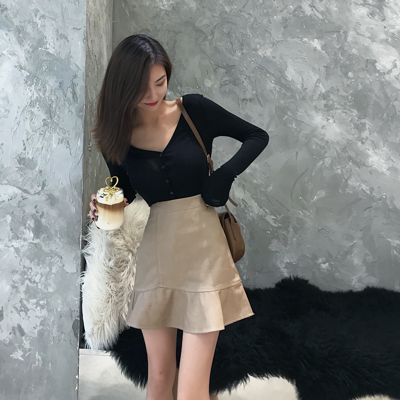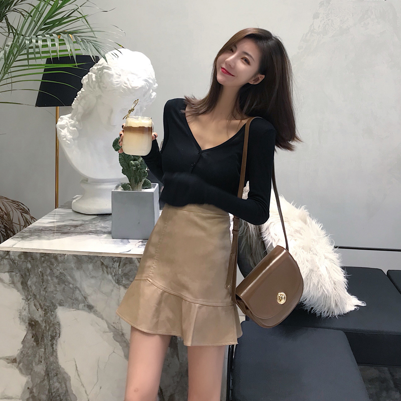 2018時尚顯瘦荷葉邊PU皮短裙彈力修身V領單排扣打底衫氣質套裝女