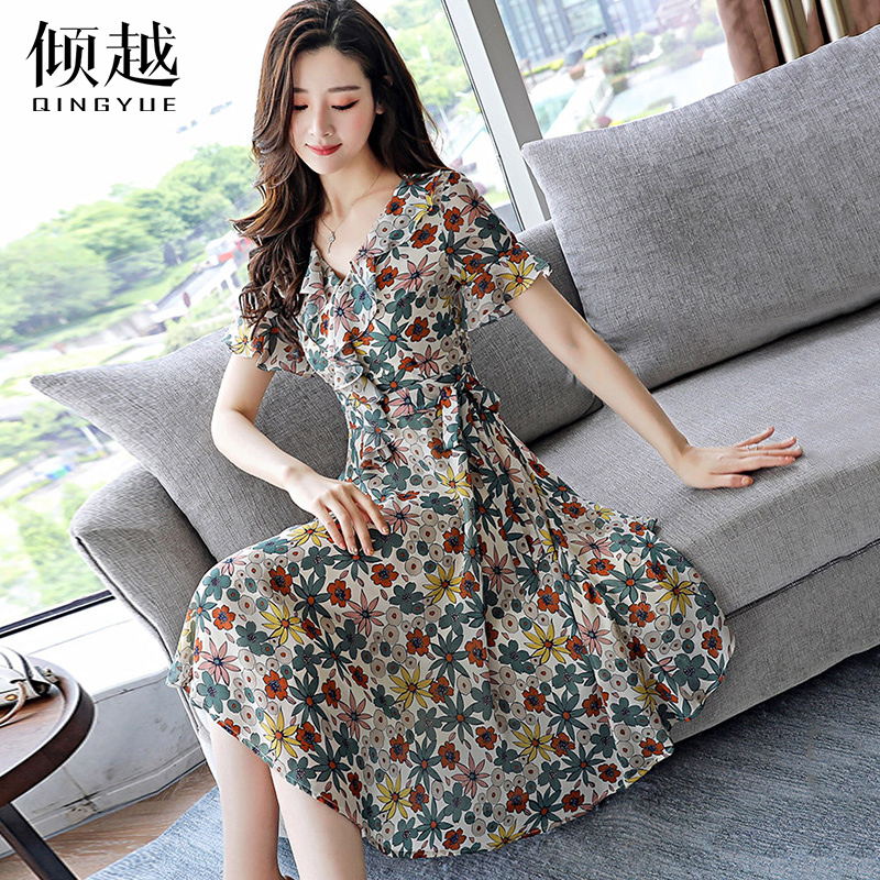 雪紡連衣裙短袖女夏裝氣質韓版修身顯瘦2017新款碎花中長款長裙子
