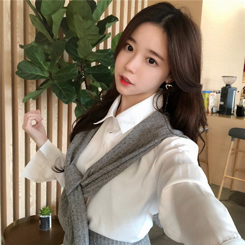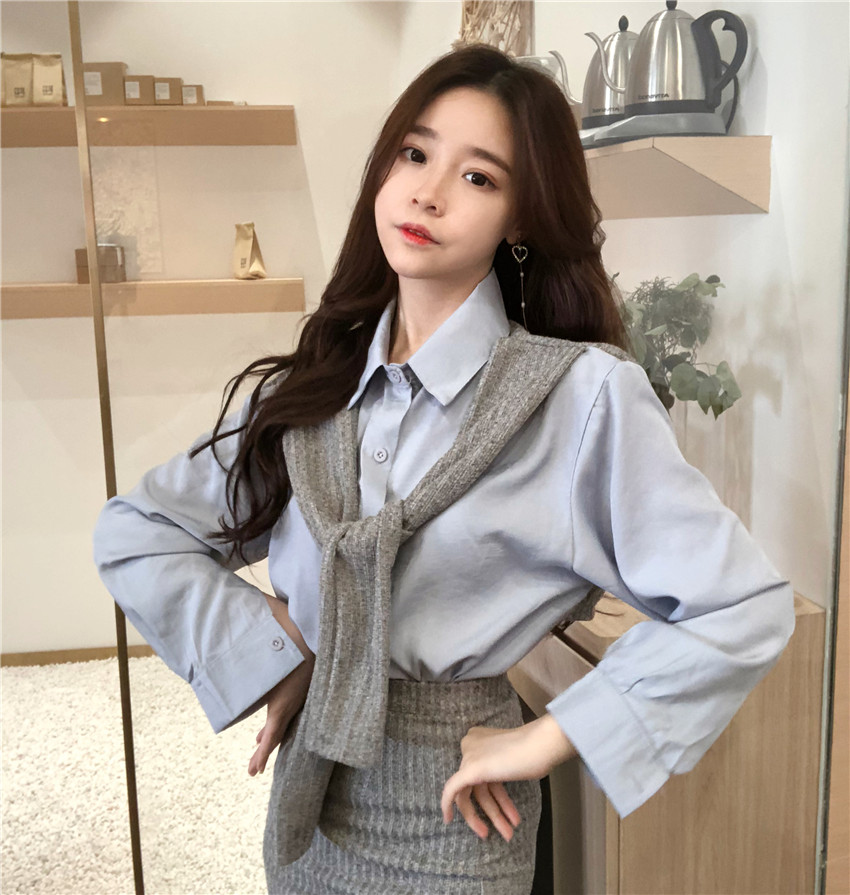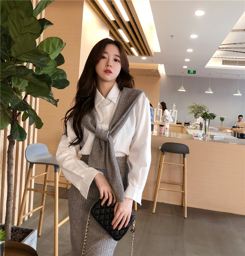 / 韓版chic拼接假袖子長袖襯衫女+高腰包臀針織半身裙兩件套套裝潮