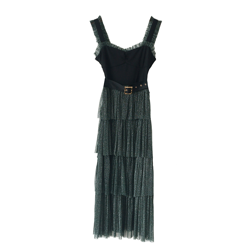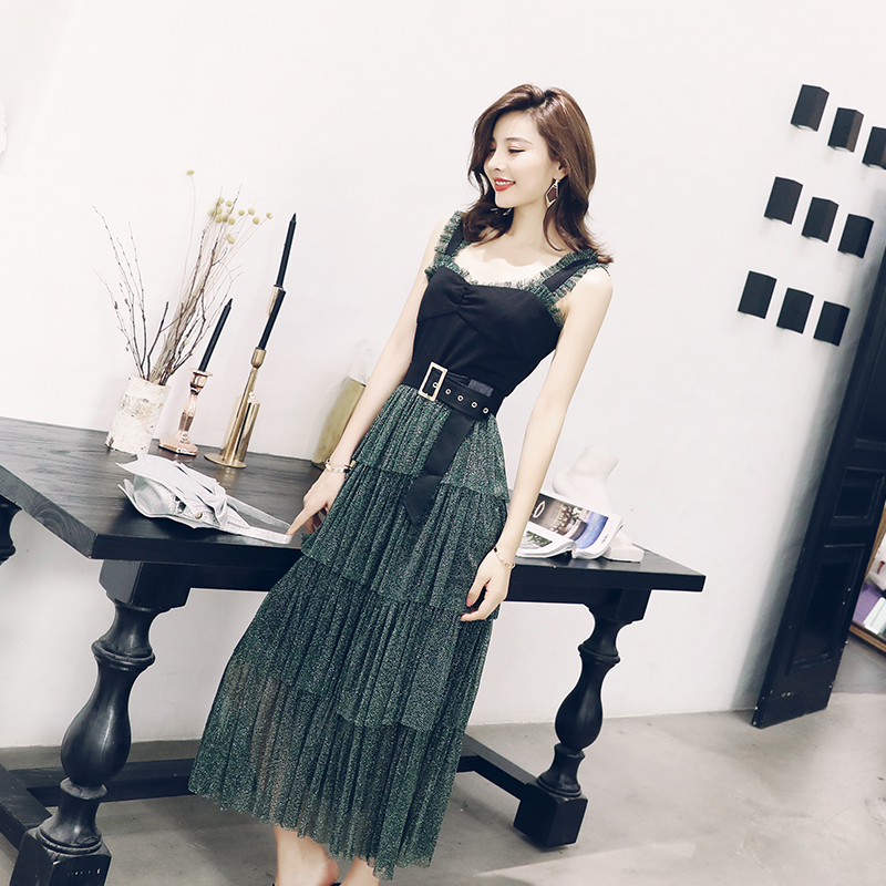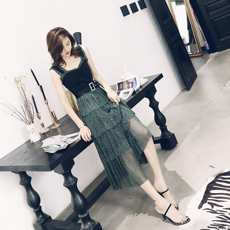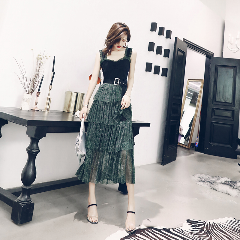 / 名媛小心機網紅港味超仙慵懶風壓褶高腰吊帶裙連衣裙女夏2018新款