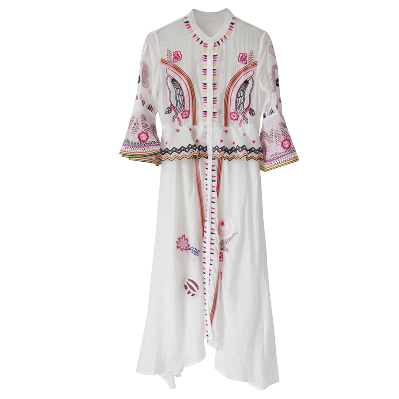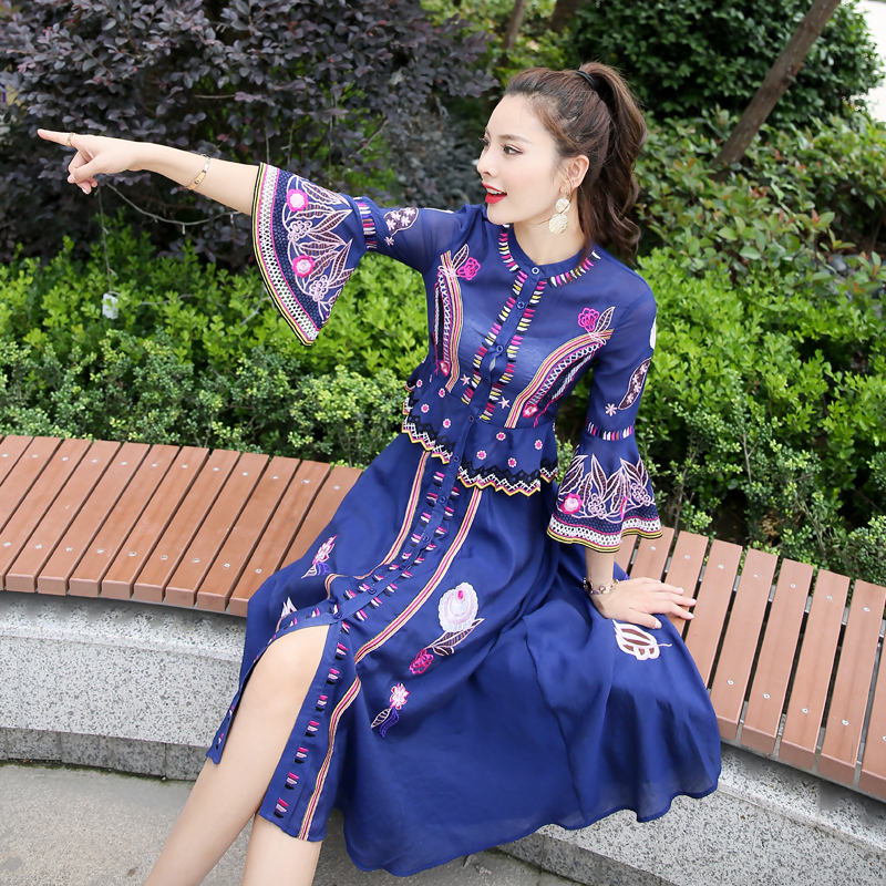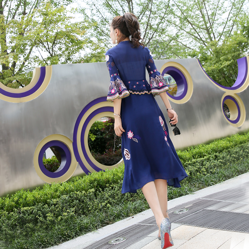 / 夏季新款復古刺繡七分花瓣袖連衣裙女夏氣質名媛拼接中長款裙子潮