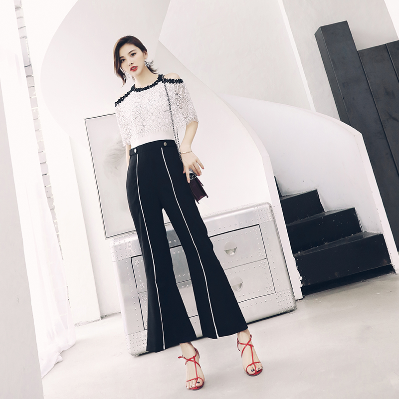 / 連體褲女2018夏季新款露肩上衣高腰顯瘦氣質開叉闊腿褲喇叭連衣褲