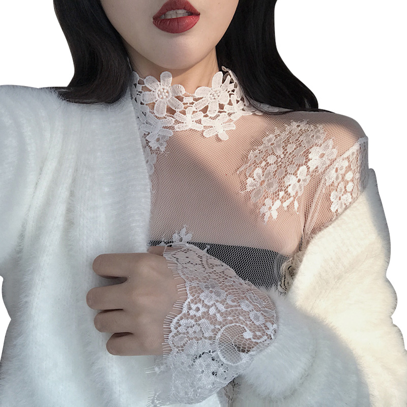 / 秋冬新款chic風透視蕾絲花邊打底衫鏤空高領網紗喇叭袖內搭上衣女
