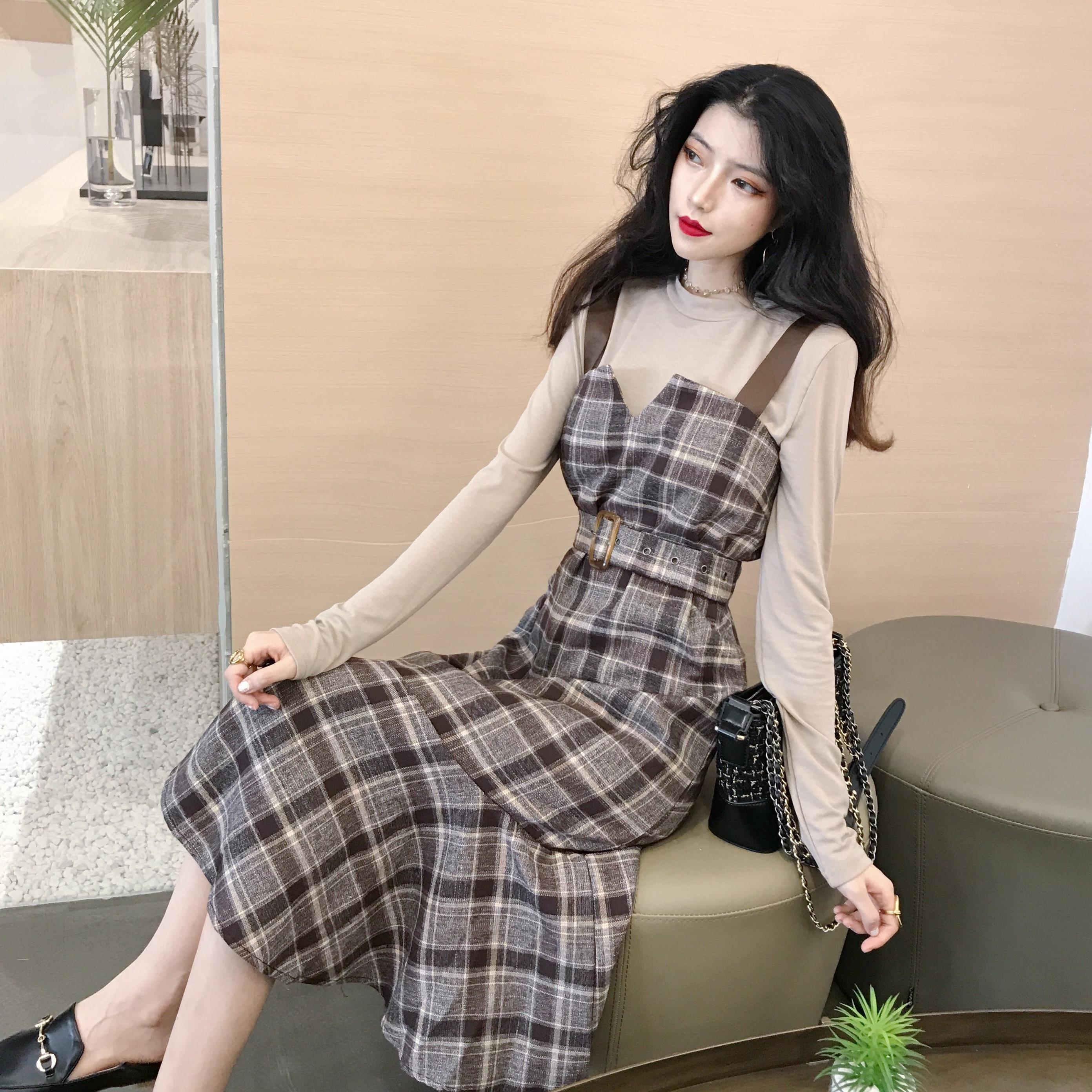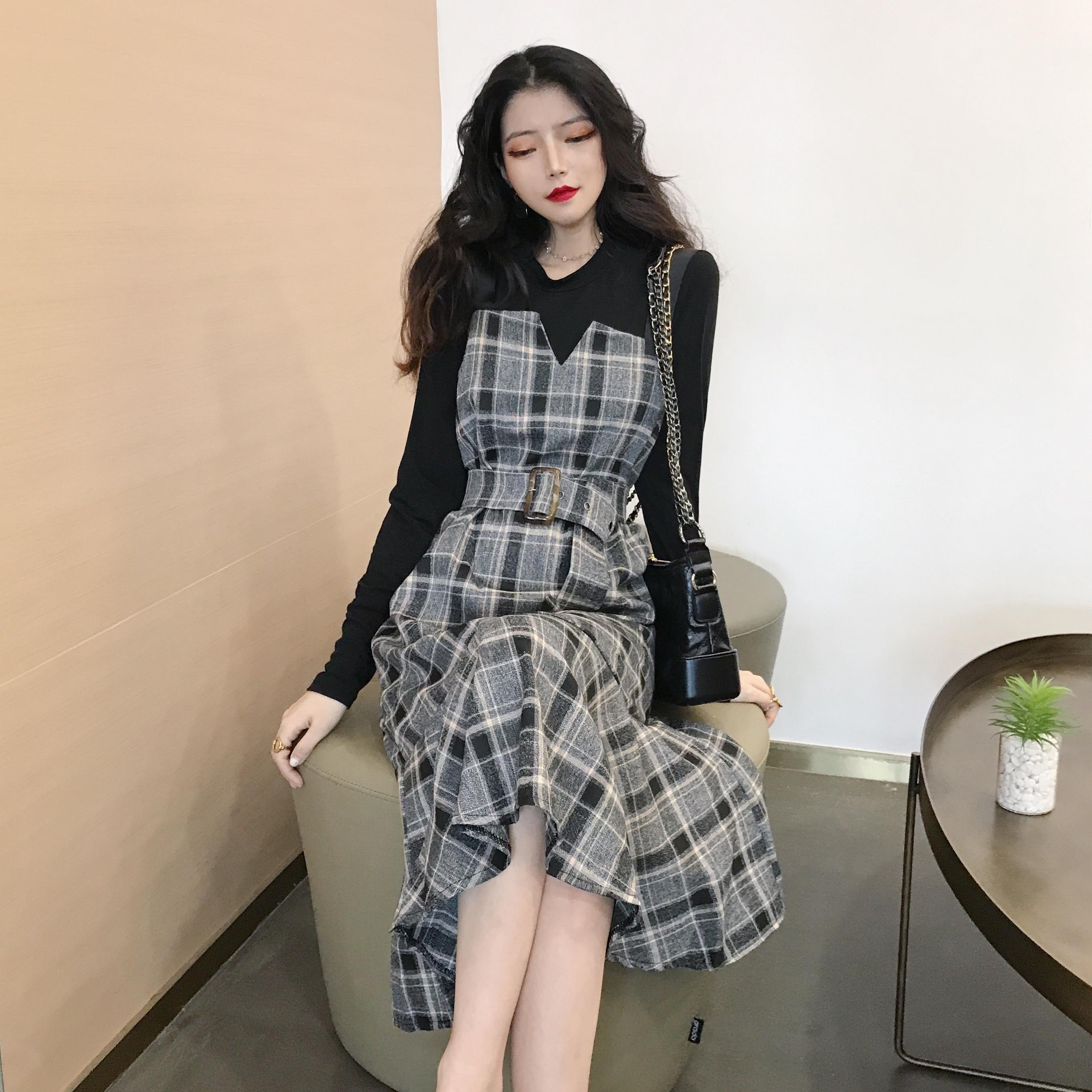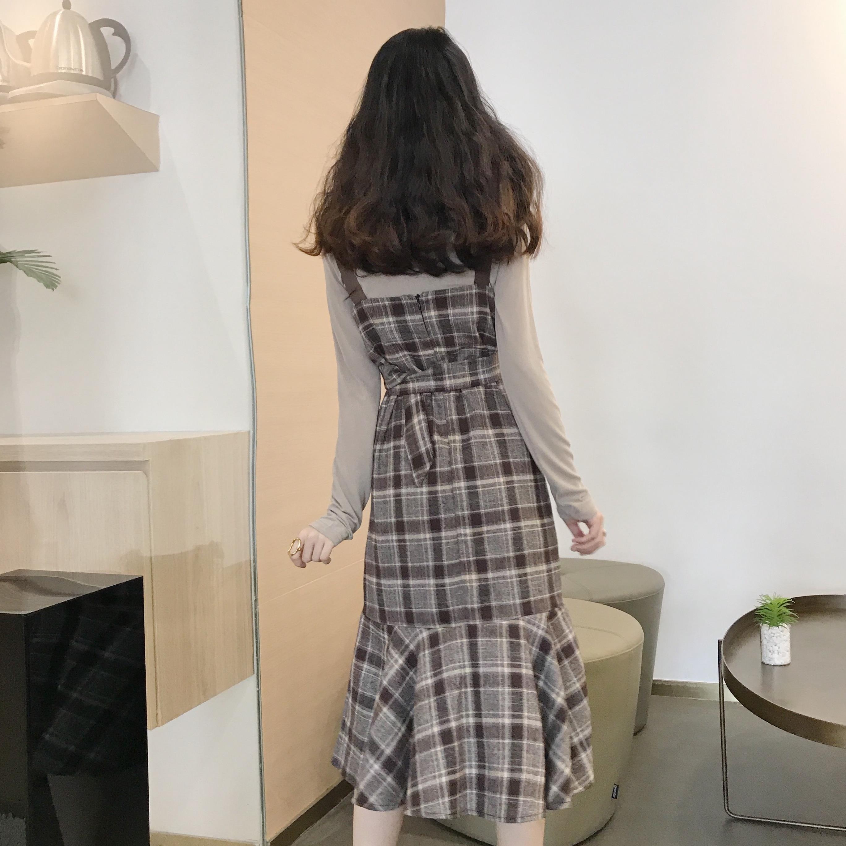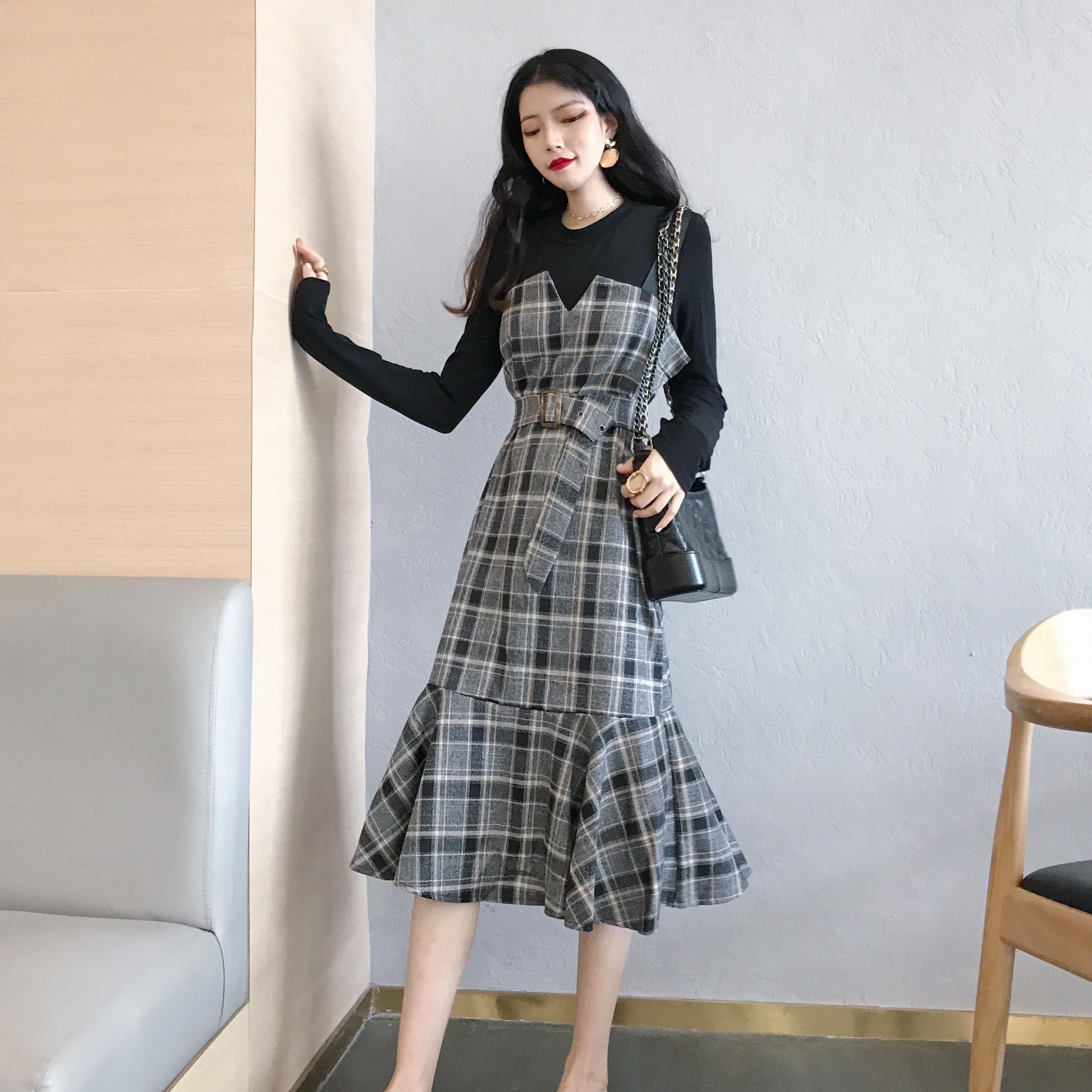 / 新款純色打底衫T恤V領吊帶魚尾中長款連衣裙女人味氣質秋裝套裝潮