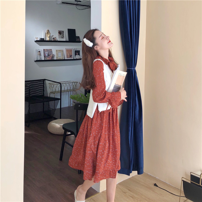 / 韓國鬼馬少女系甜美木耳邊收腰大擺裙+森系麻花毛衣馬甲時尚套裝