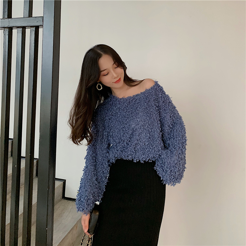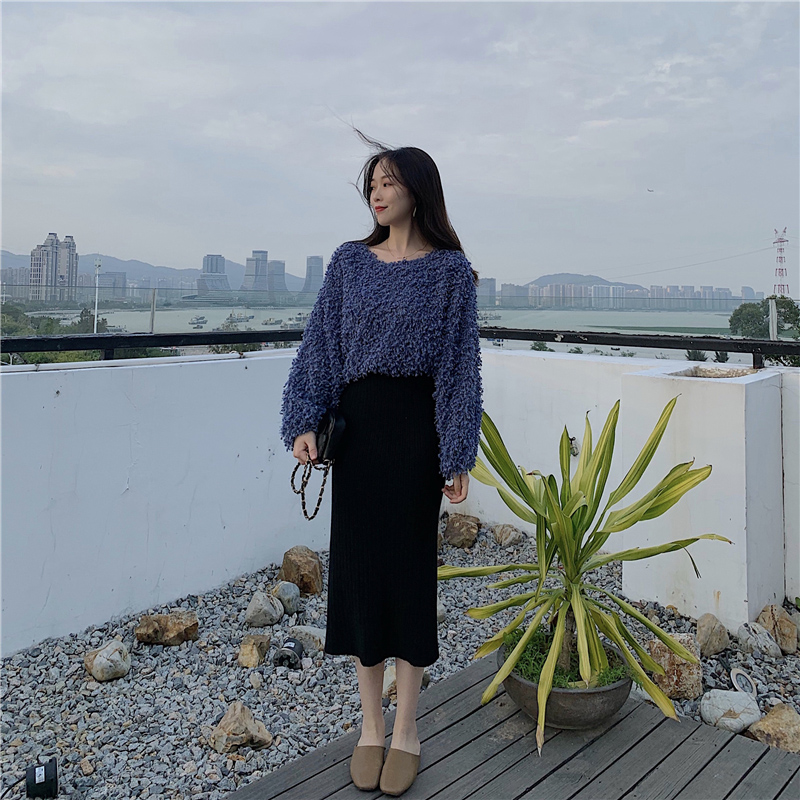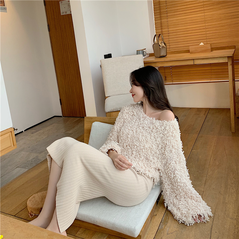/ 韓版寬松顯瘦燈籠袖毛毛上衣兩件套開叉中長款針織半身裙時尚套裝