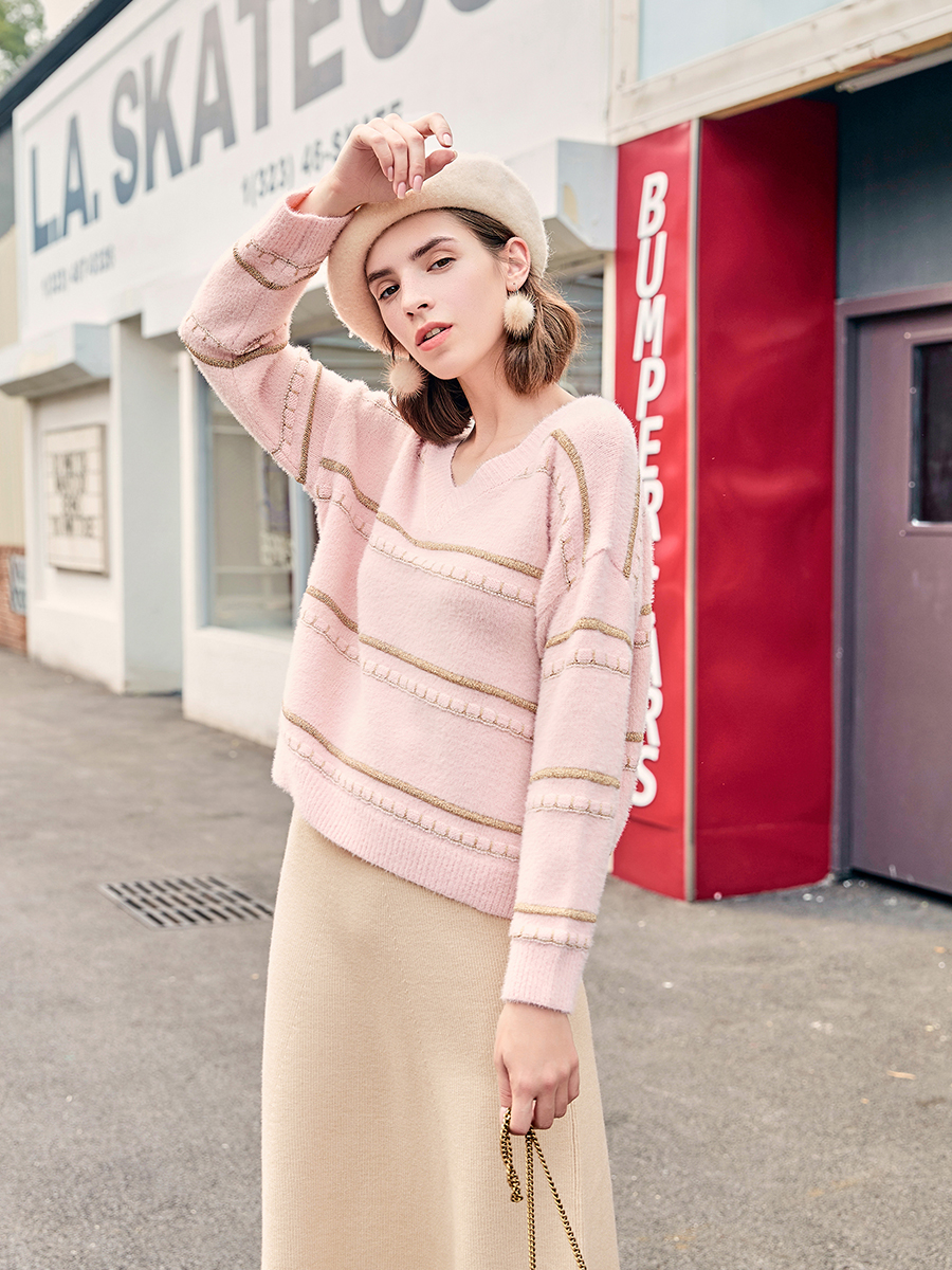MG小象小清新毛衣女甜美秋冬溫柔風新款套頭寬松V領條紋針織衫潮