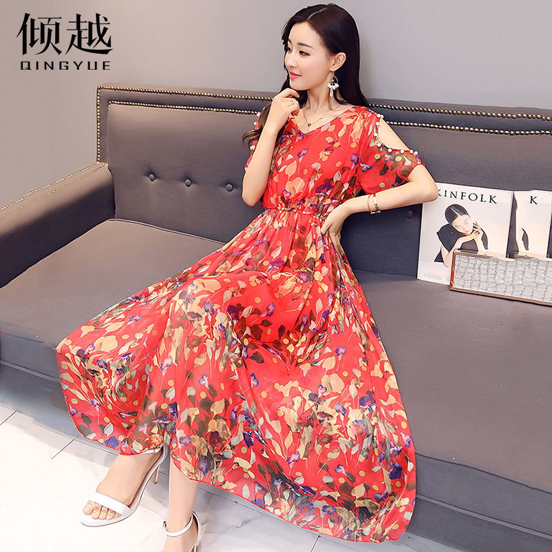 夏季淑女V領碎花雪紡連衣裙女式松緊腰顯瘦長裙子釘珠短袖大擺裙