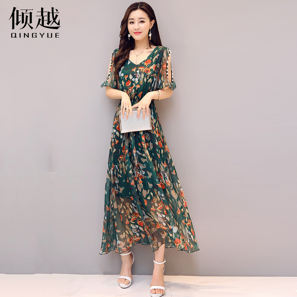 / 夏季淑女V領碎花雪紡連衣裙女式松緊腰顯瘦長裙子釘珠短袖大擺裙