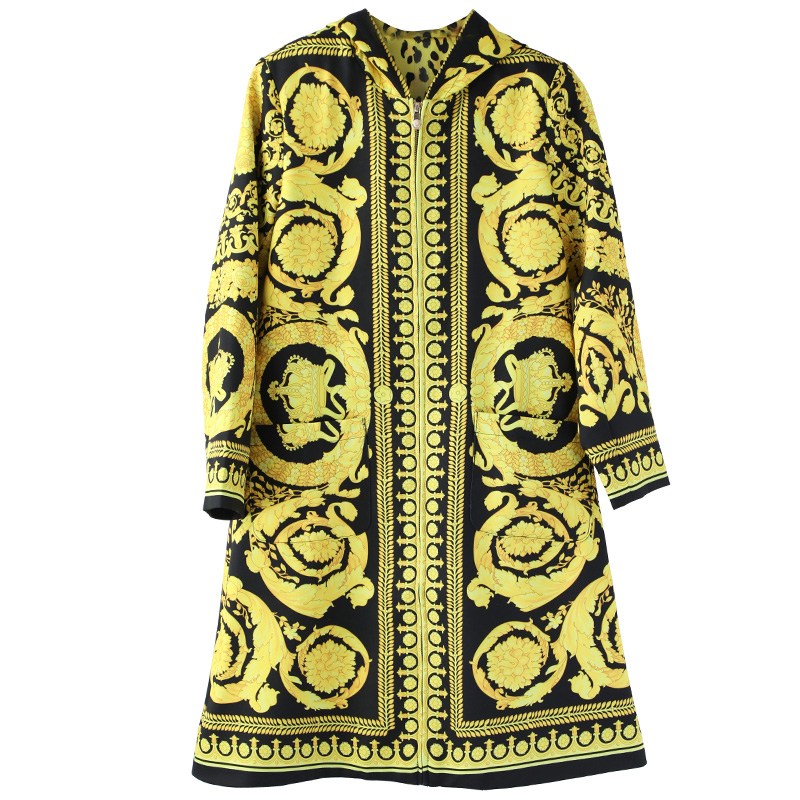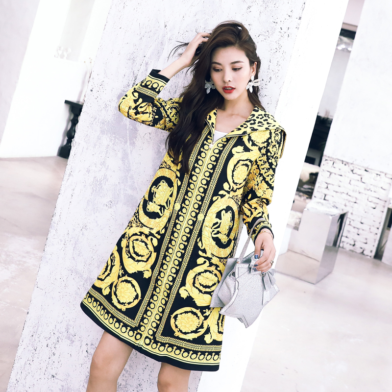 2018秋裝歐貨新款印花寬松chic復古休閑連帽外套潮風衣女中長款