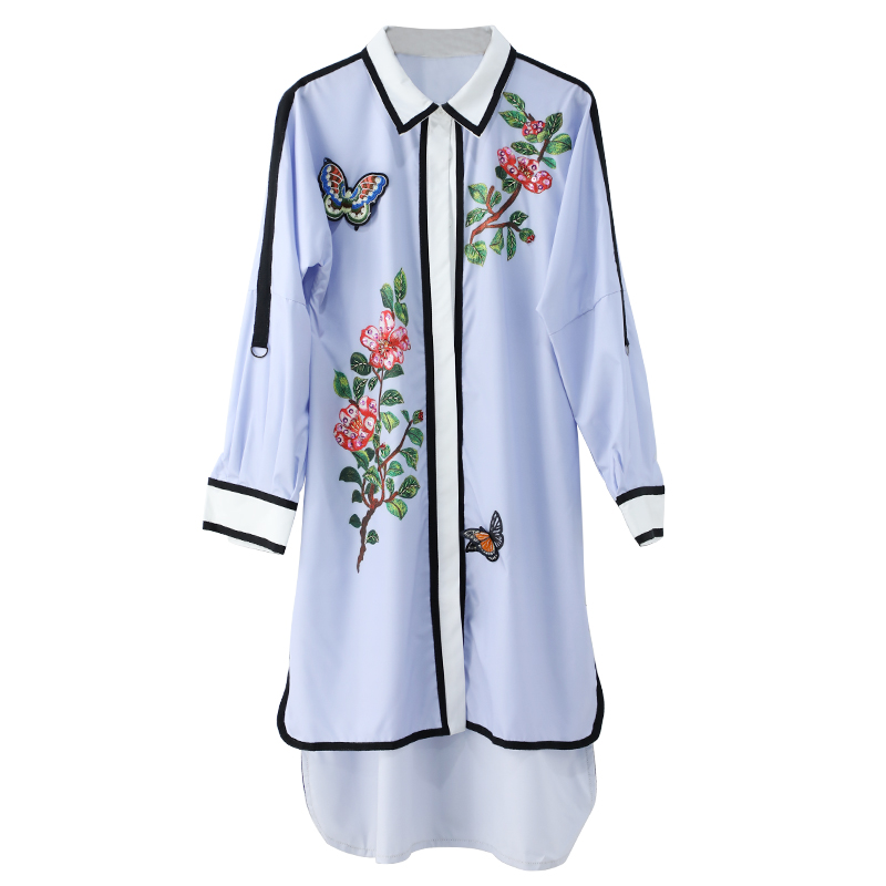 / 名媛氣質2018新款韓版中長款復古刺繡印花長袖襯衫中長款連衣裙女