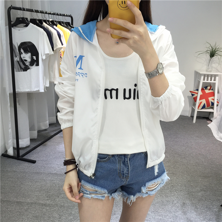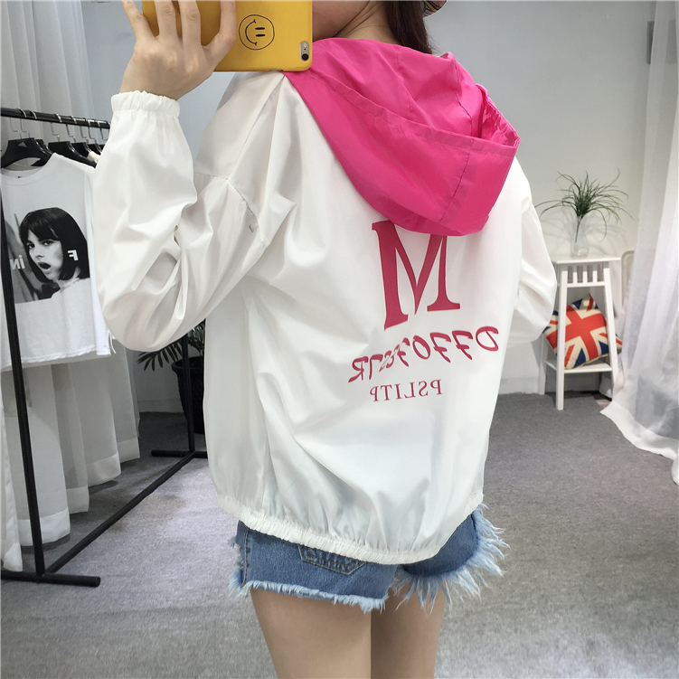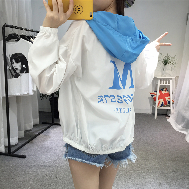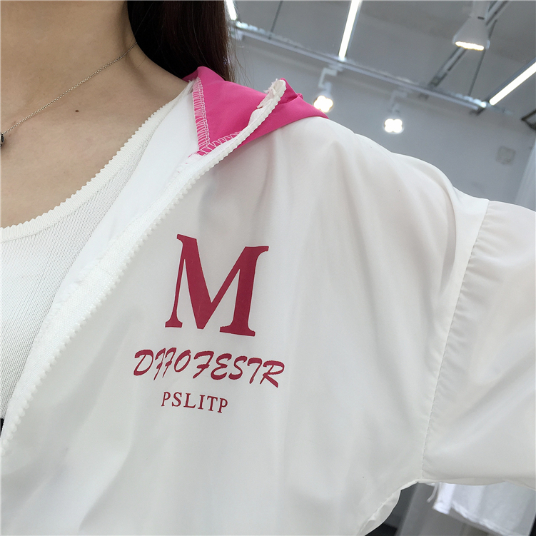 薄款印花字母防曬衣潮夏季原宿bf學院風寬松連帽拼色拉鏈衫外套潮