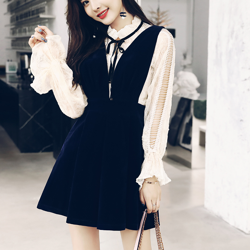 絲絨連衣裙女秋2018新款氣質優雅背心裙小個子蕾絲上衣兩件套裝裙