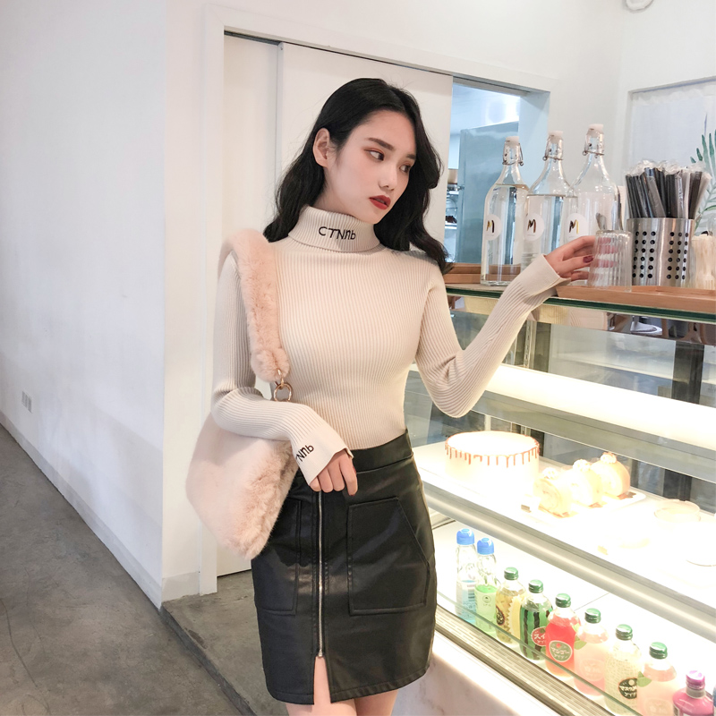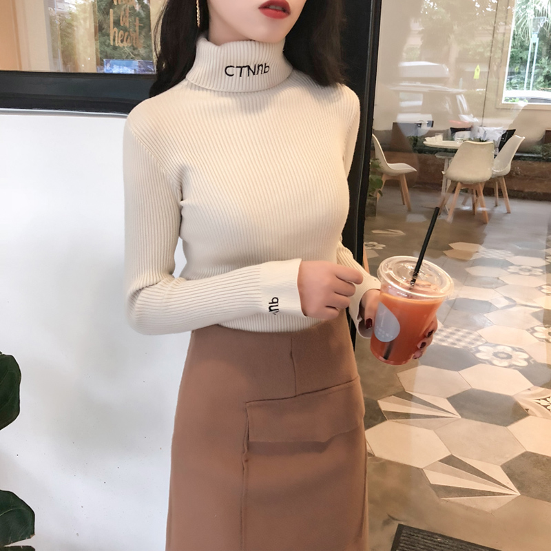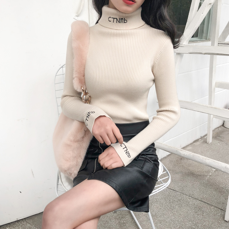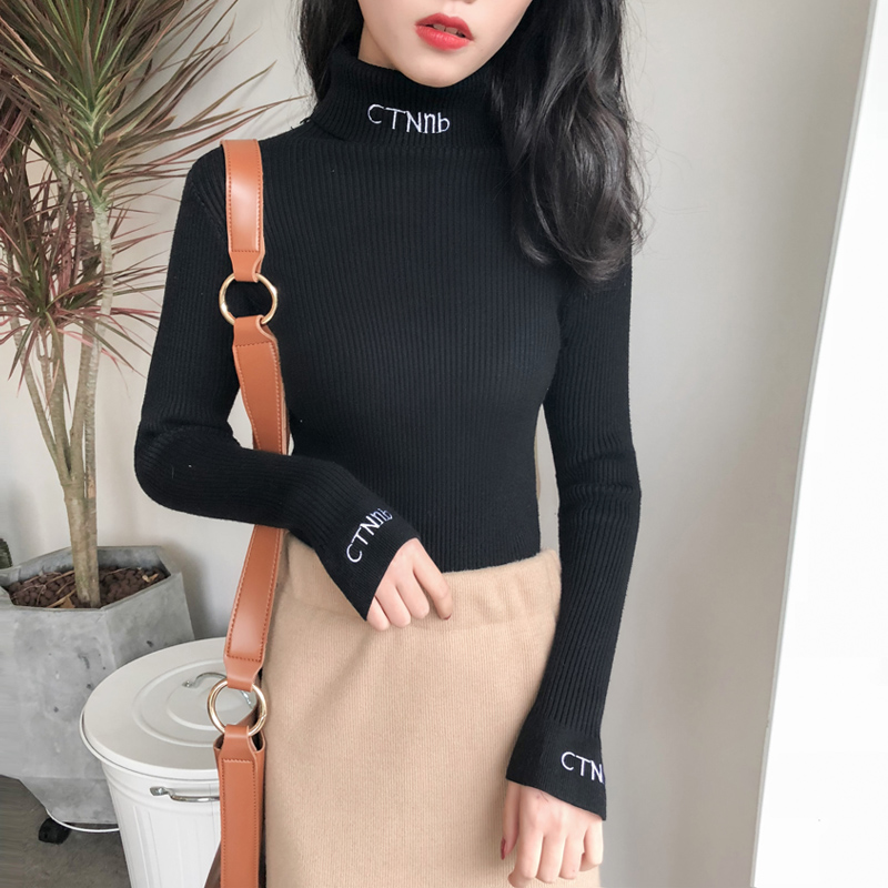 秋季新款字母刺繡時尚高領氣質毛衣女長袖修身顯瘦彈力打底針織衫