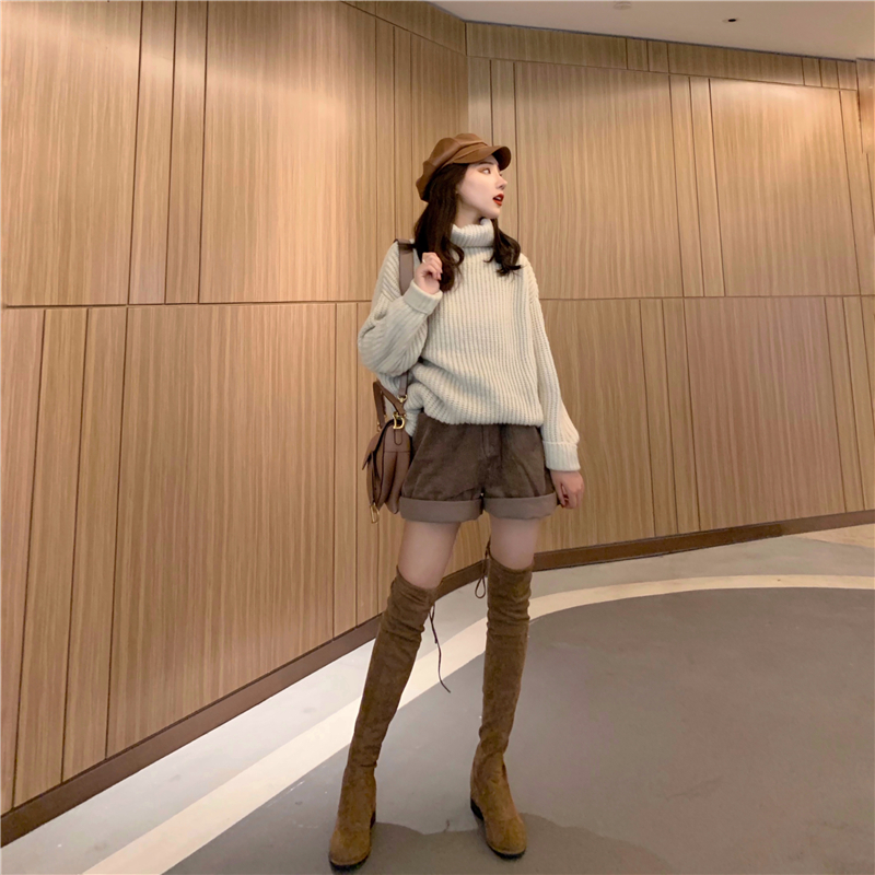 / 秋冬新款高領慵懶風毛衣寬松時尚卷邊燈芯絨短褲時尚套裝兩件套女