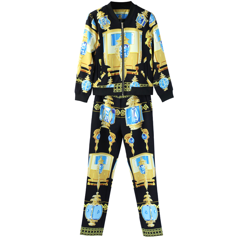 港味休閑兩件套2018秋裝新款個性印花長袖夾克九分小腳褲運動套裝