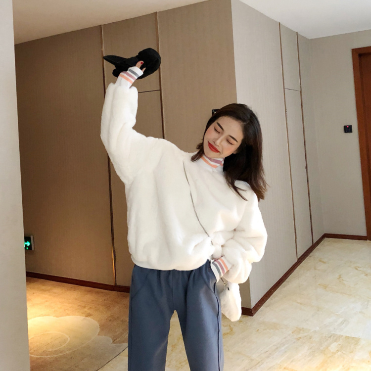 新款寬松毛絨加厚套頭衛衣上衣外套毛呢休閑褲呢子長褲女時尚套裝
