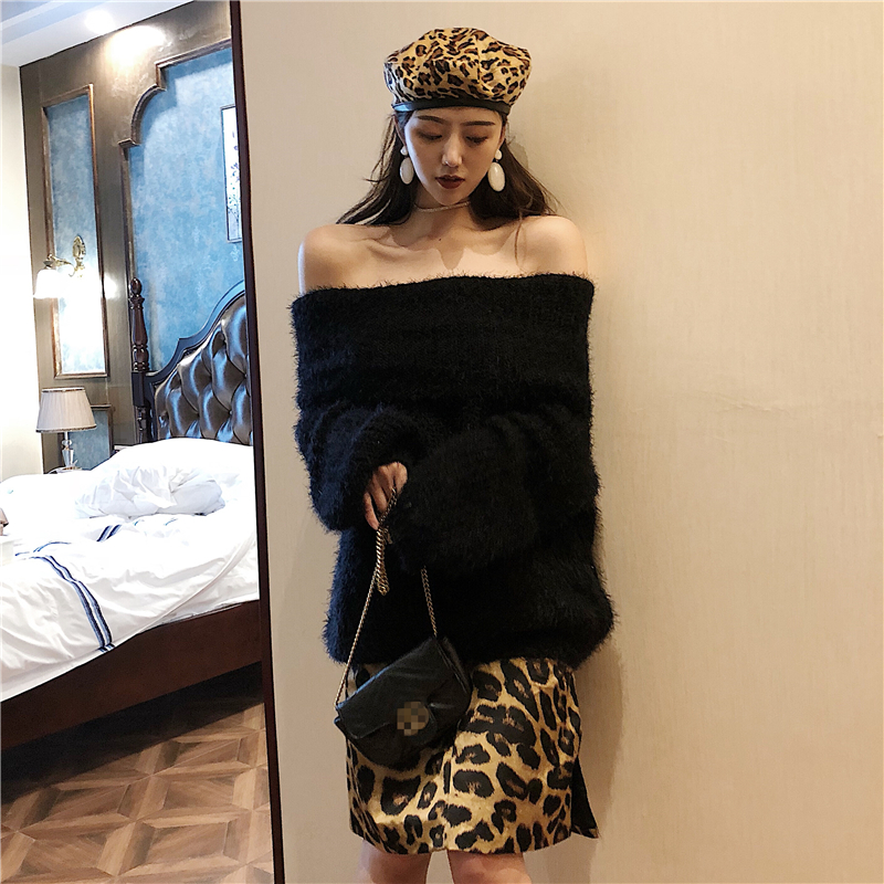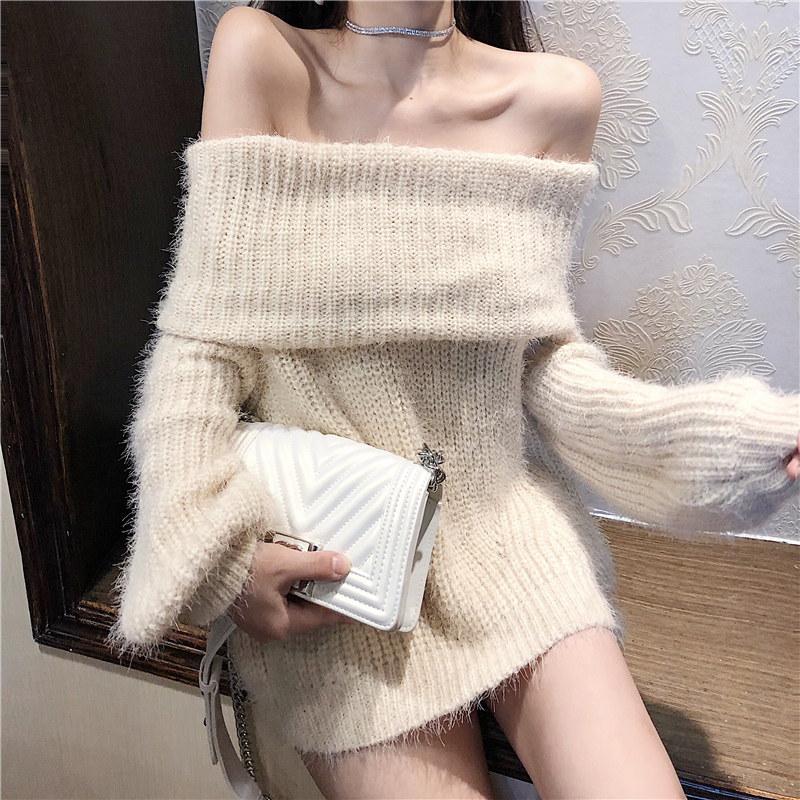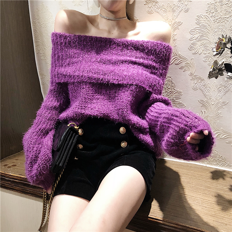 2018新款韓版毛衣女性感露肩一字肩大翻領針織衫加厚寬松打底上衣
