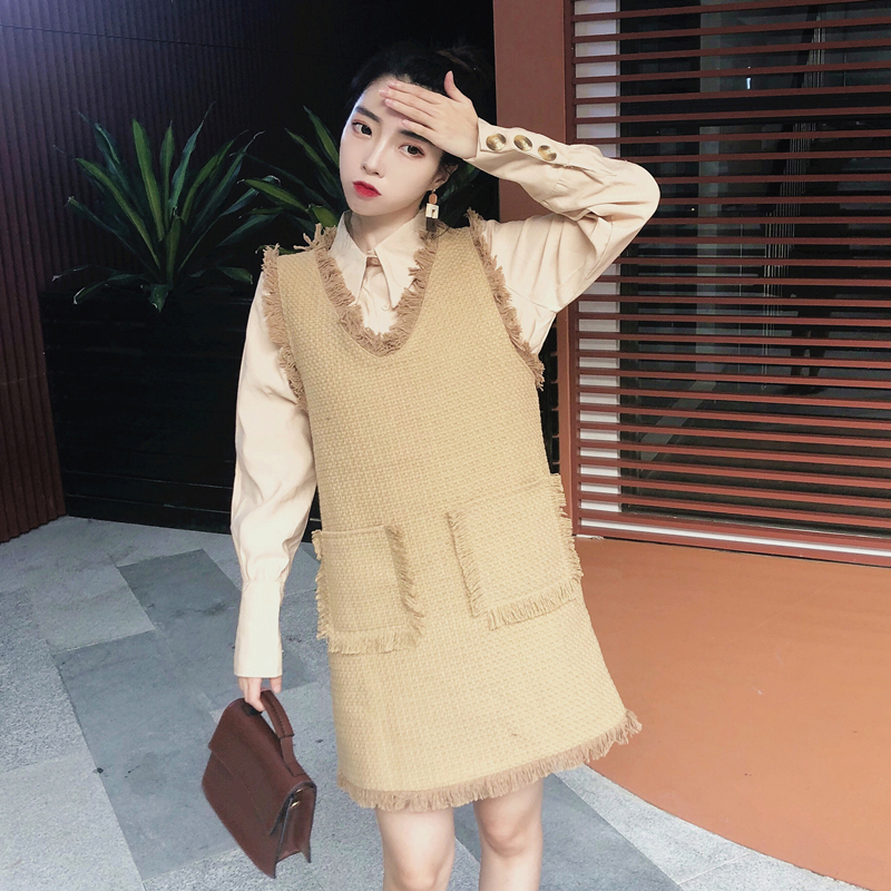 秋裝小香風粗花呢中長款V領馬甲背心裙小翻領純色襯衫女時尚套裝