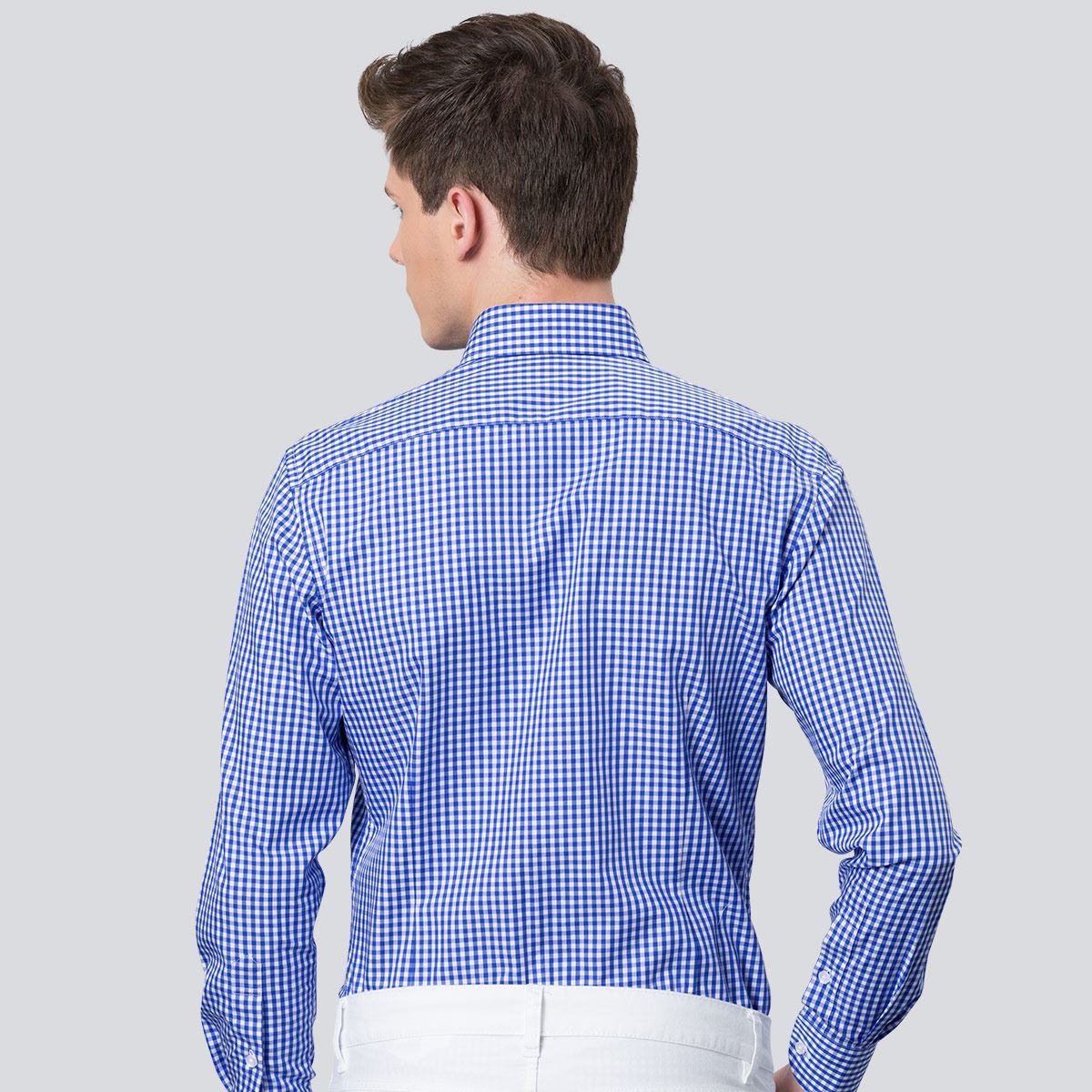 秋季藍白小格子男士長袖襯衫高支棉修身免燙韓版正裝釘扣領男襯衣