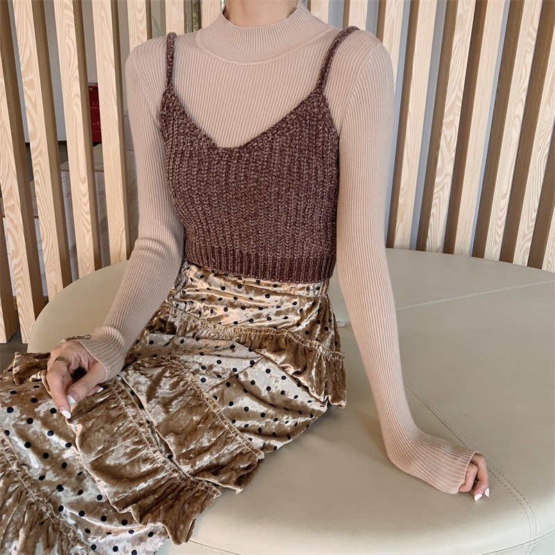 韓版氣質高腰荷葉邊A字裙+后背綁帶針織吊帶女+針織打底衫三件套